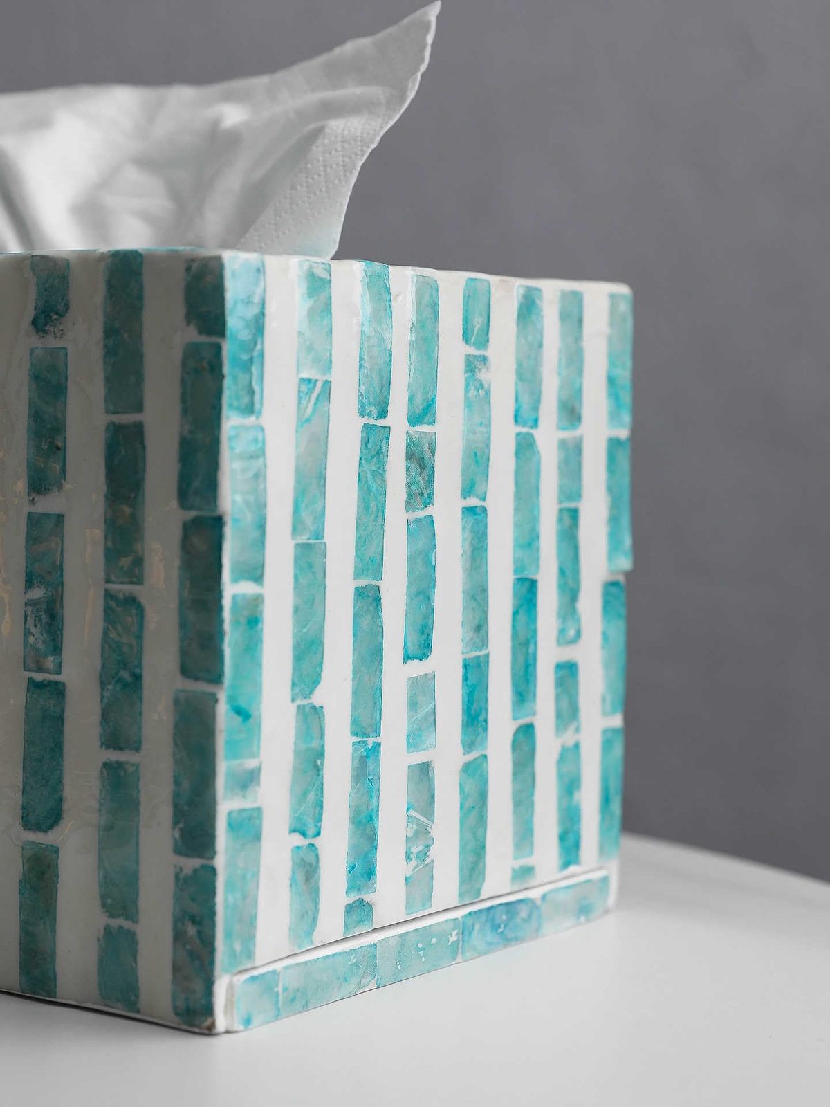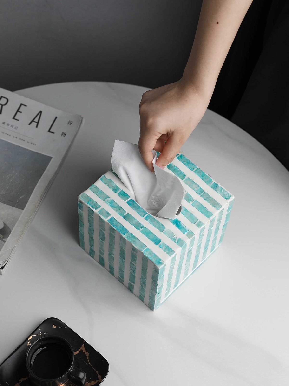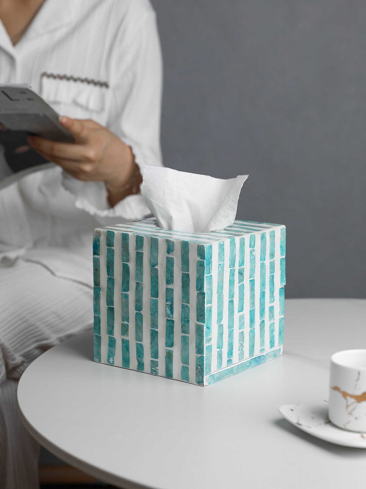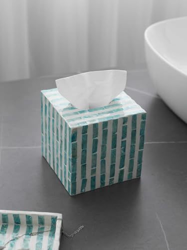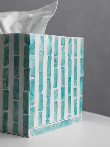 Product description: Transform your space with this stunning modern tissue box holder, meticulously handcrafted with beautiful blue and pearl white shell mosaic tiles. Measuring 5.51 inches in all dimensions, this square tissue holder perfectly accommodates standard tissue cubes while adding a touch of sophisticated style to any room. The durable resin construction ensures longevity, while the luxurious shell detailing creates a captivating visual texture that elevates your decor. Perfect for bathrooms, bedrooms, living rooms, or office spaces, this versatile tissue holder combines everyday functionality with artistic design. The smooth polished surface is easy to clean, and the accessible base makes refilling simple. Add this distinctive decorative accent to your home or give it as a thoughtful gift for someone who appreciates unique, handcrafted home accessories.