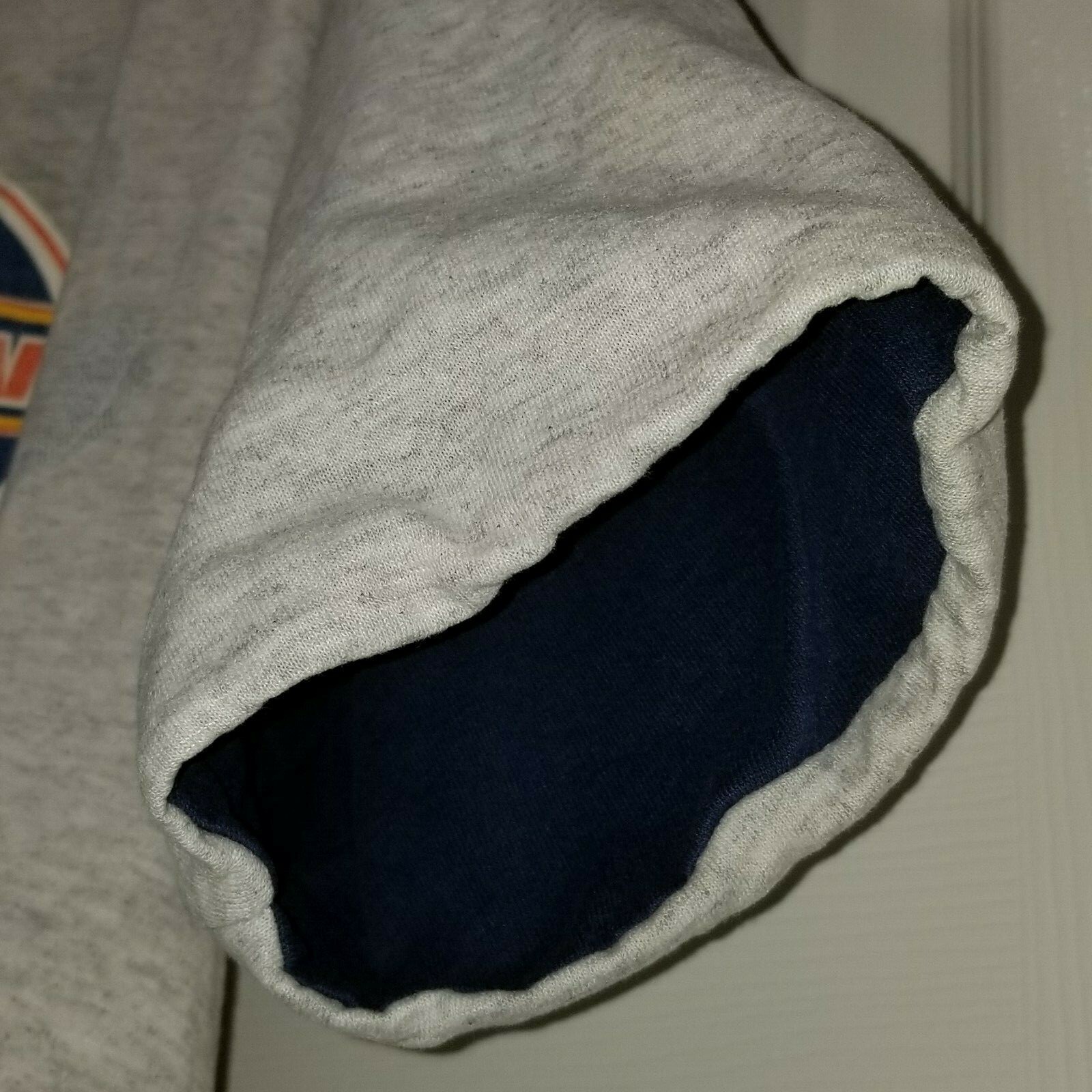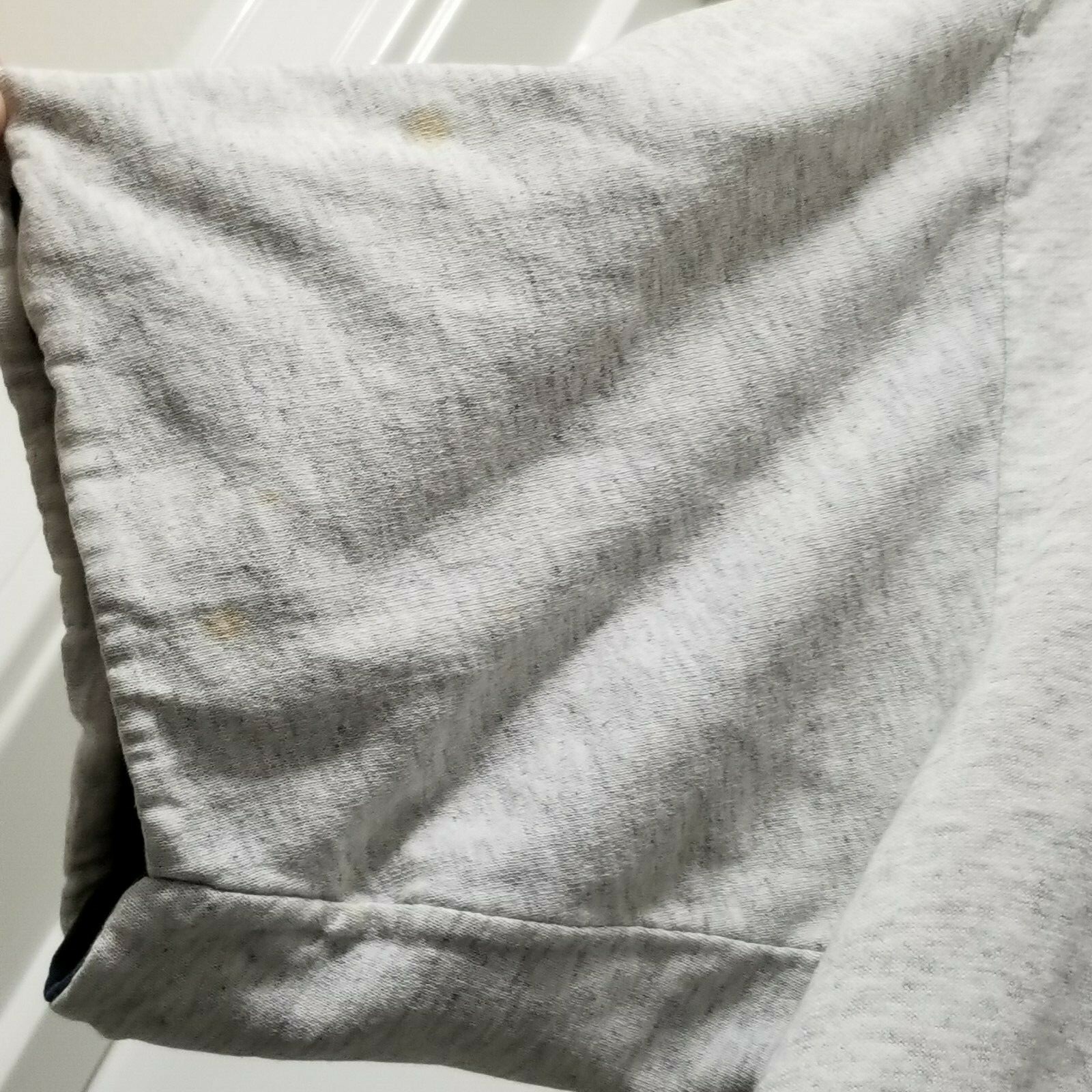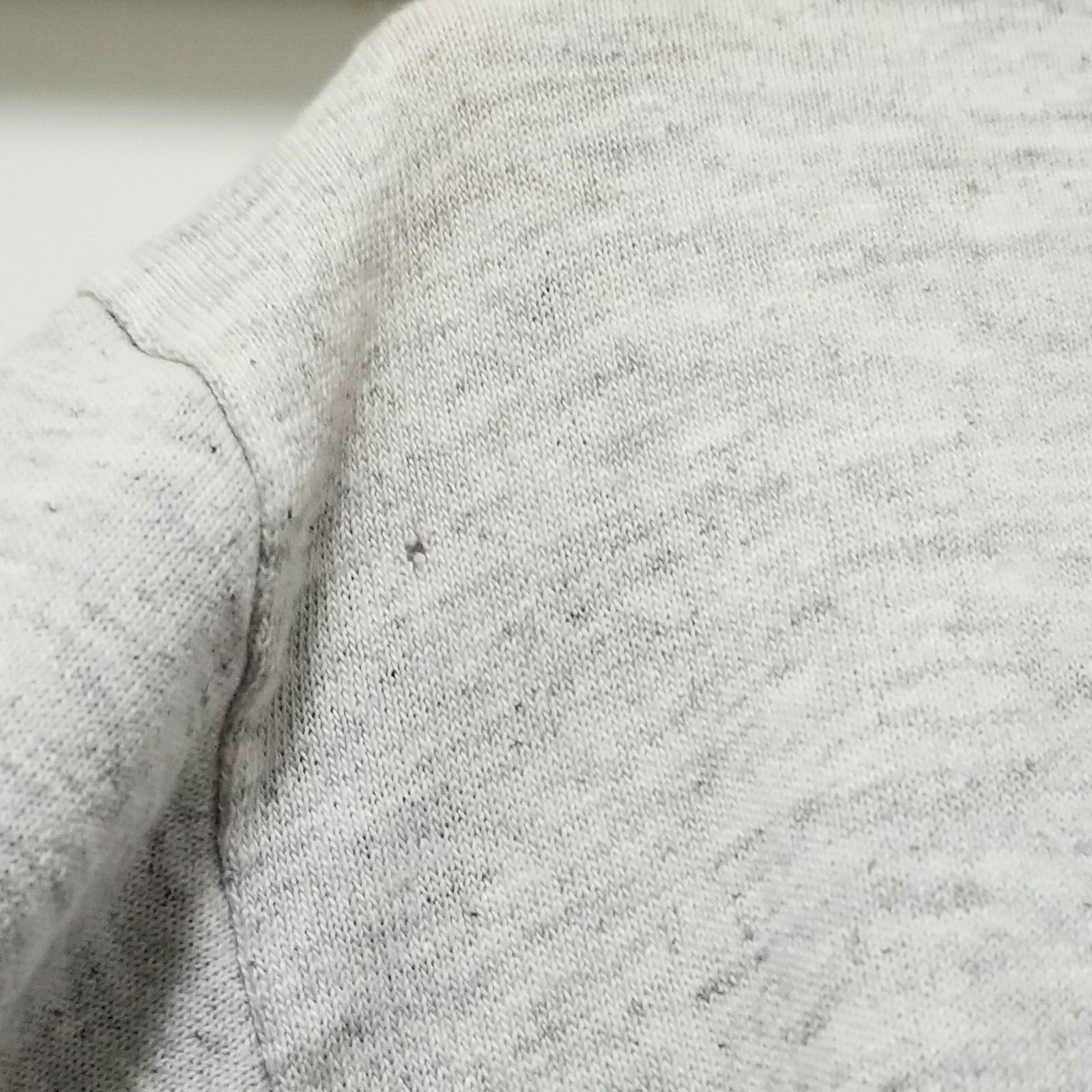 Description: 1 small hole in the shirt and a few light stains on the sleeve Please see pictures for more.