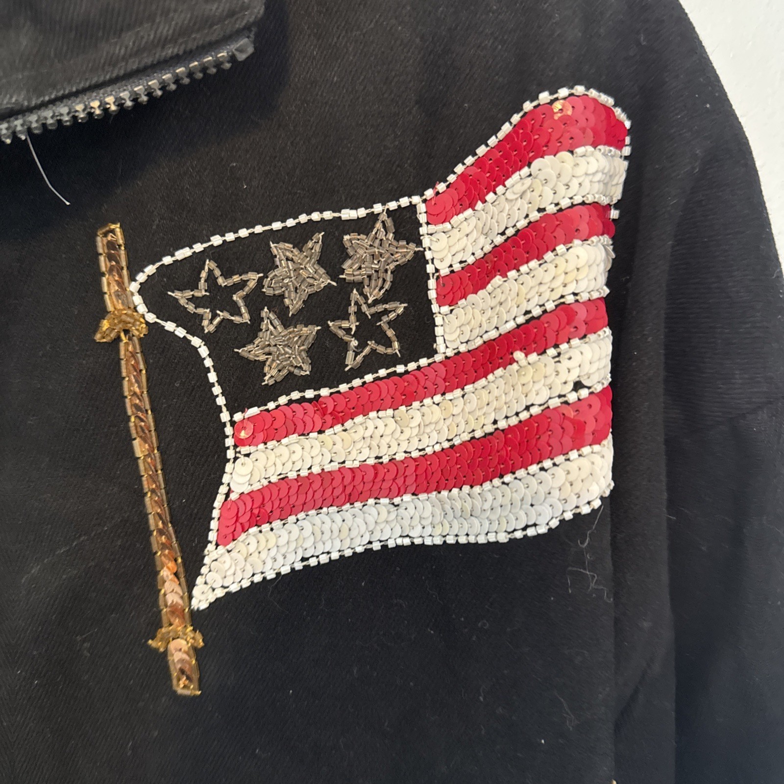 Vintage Modi Black Denim Beaded Sequin Jacket Women Size Small American Flag
