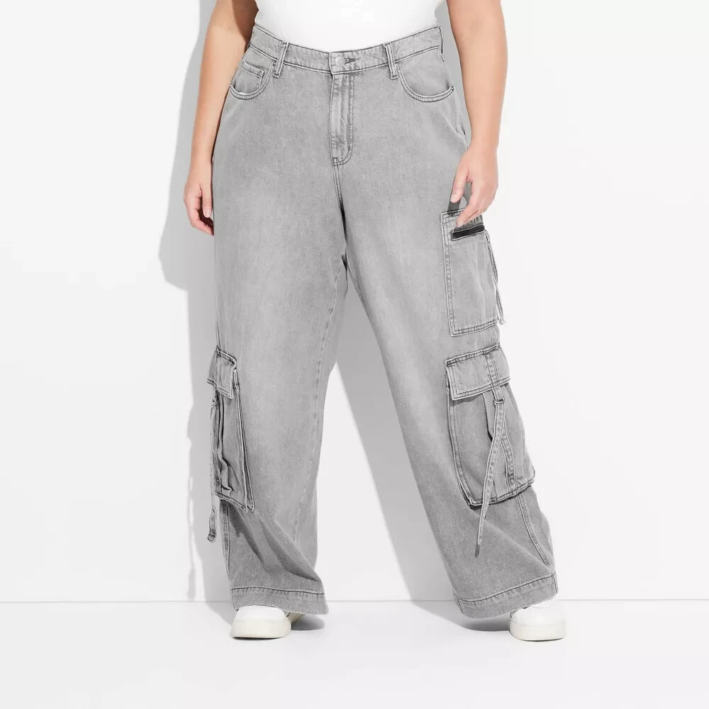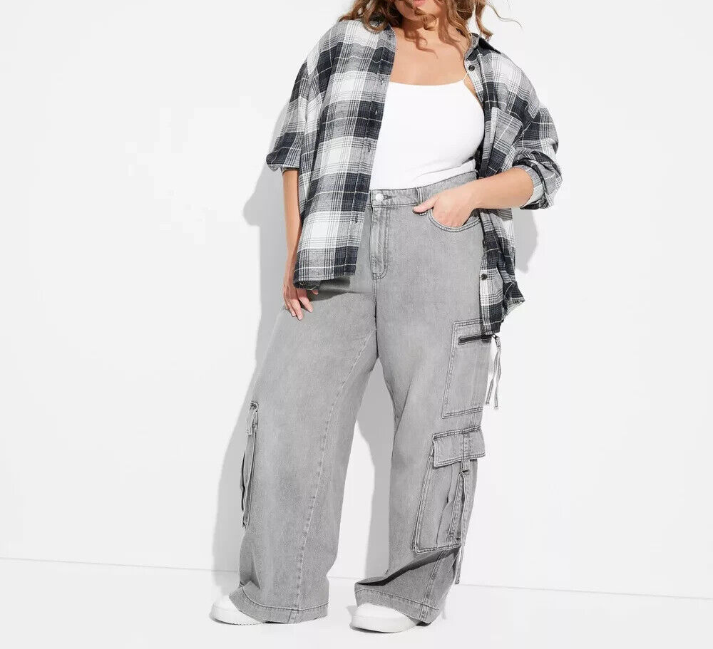 Women's Mid-Rise Wide Leg Cargo Baggy Pants (Size 17) GRAY WASH - NEW!!!