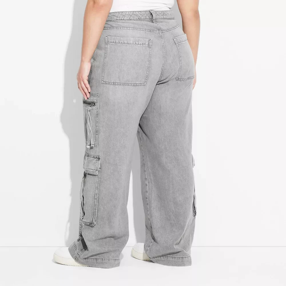 Elevate your wardrobe with these stylish Women's Mid-Rise Wide Leg Cargo Baggy Pants from Wild Fable. The gray wash denim fabric is made of 66% cotton, 20% recycled cotton, and 14% lyocell, making it durable and sustainable. The pants feature a fly button and zipper closure, as well as regular and cargo pockets, making them both practical and fashionable.