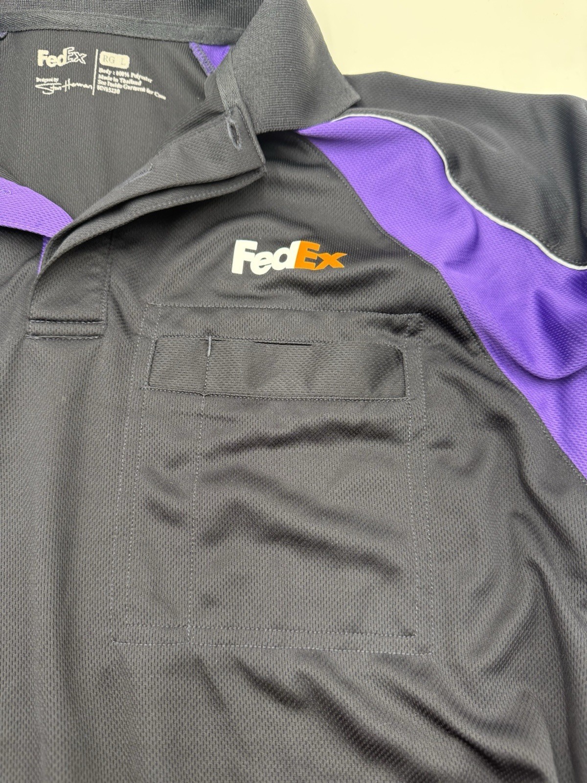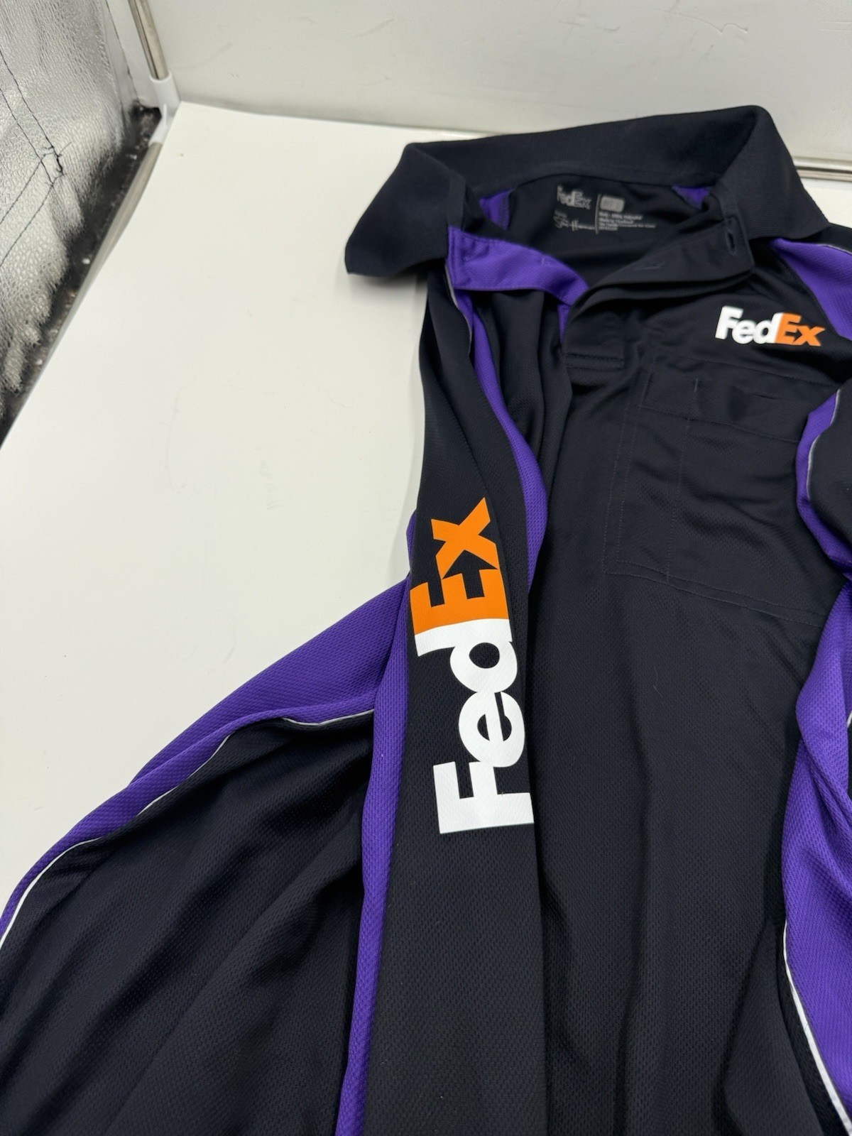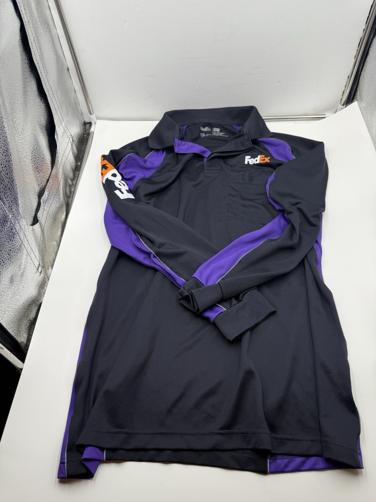The product is a Stan Herman long sleeve work shirt designed specifically for FedEx employees. Made of 100% polyester material, this shirt is quick-drying and suitable for both men and women. The size is large, and the shirt comes in a purple and blue color scheme. This shirt combines functionality with style to provide a comfortable and practical work attire for those in the FedEx industry.
