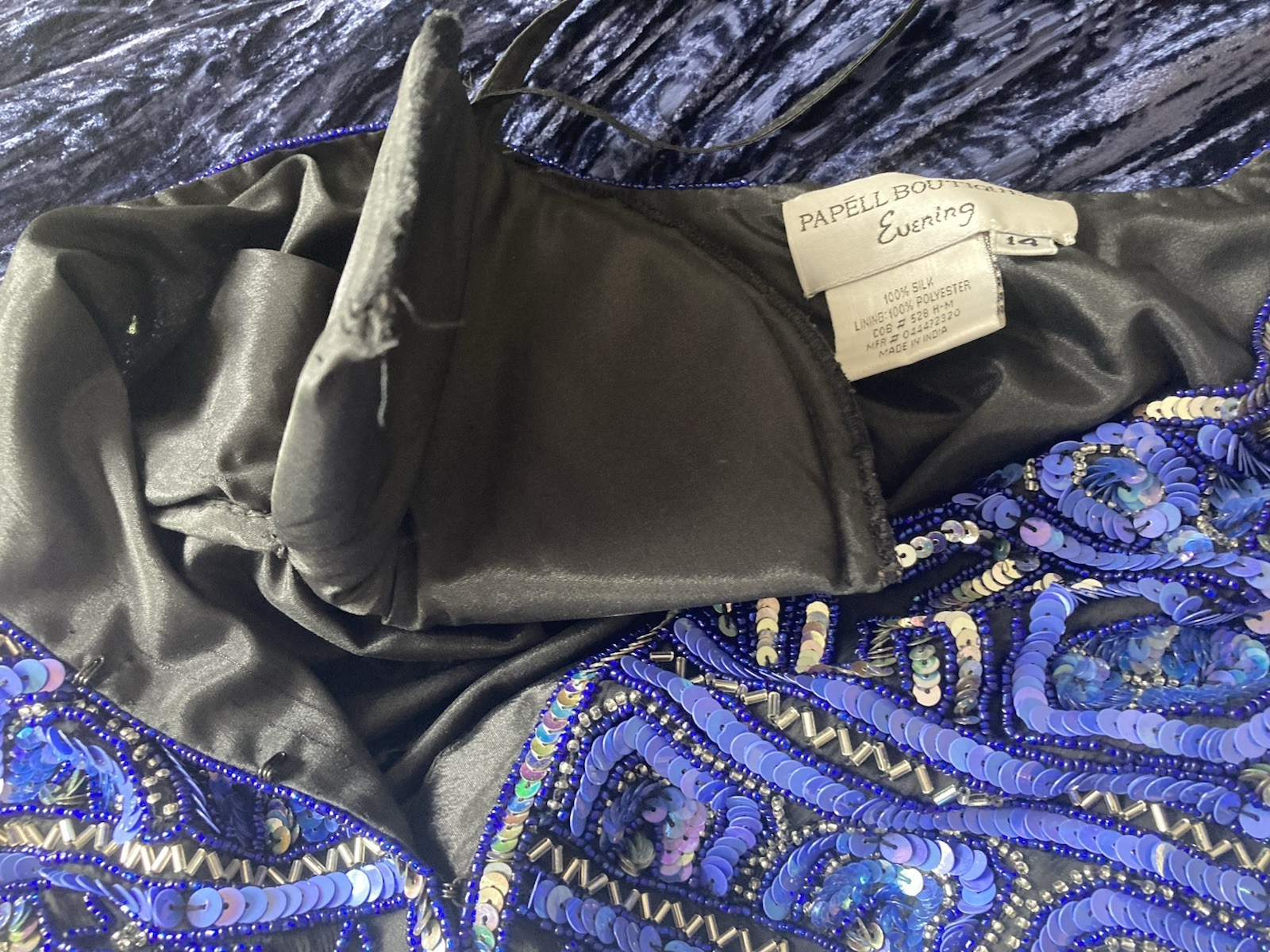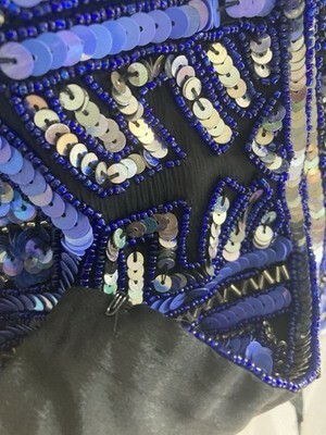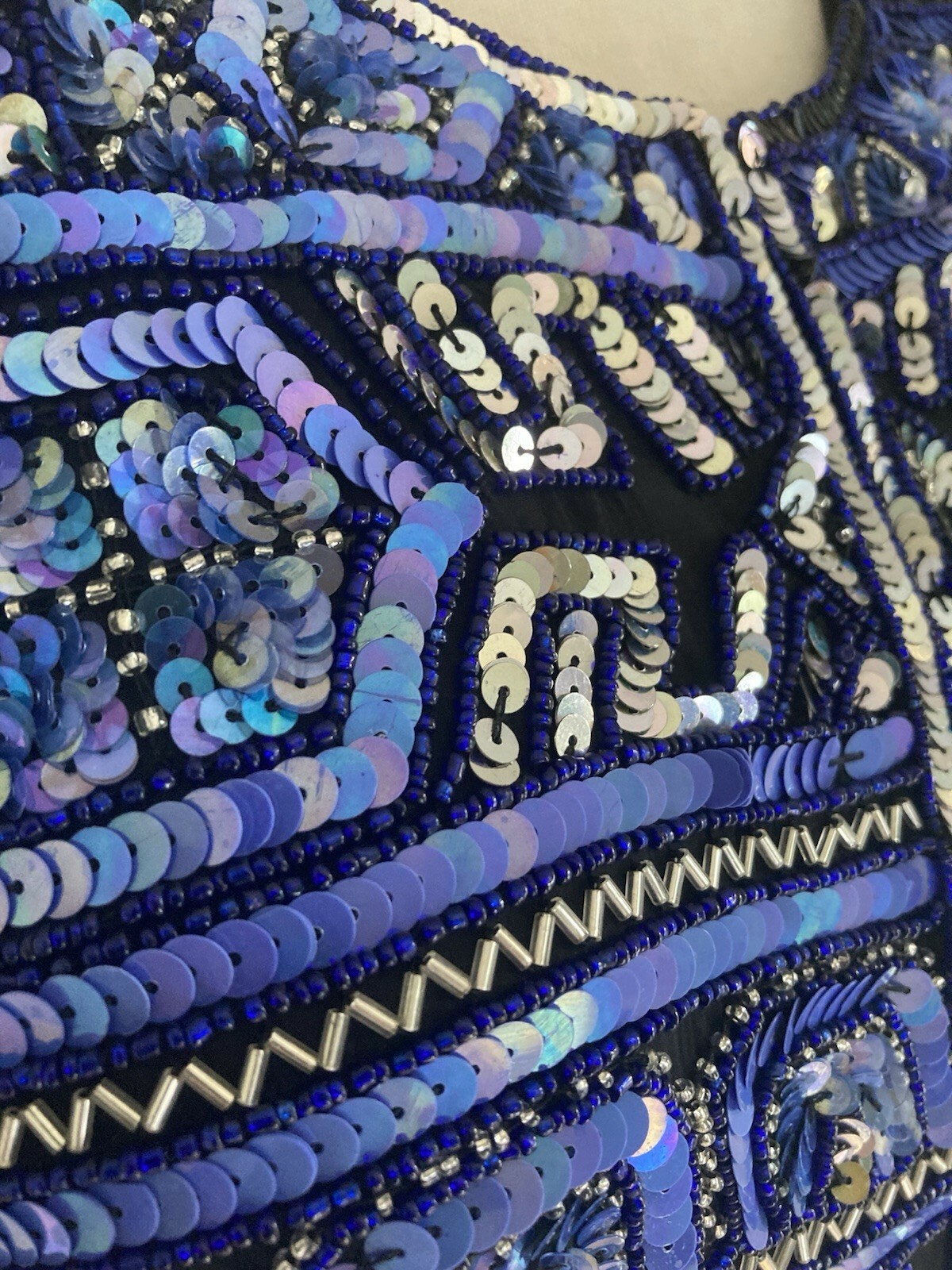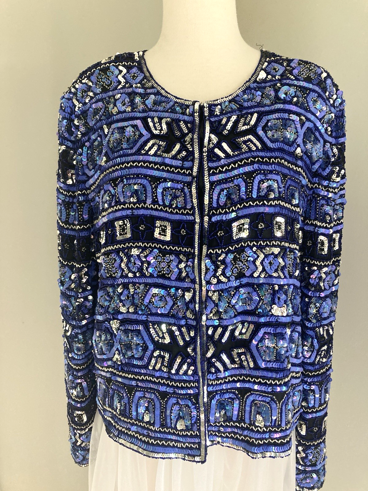 Vintage Adriana Papell Boutique Evening Jacket. 100% Silk, all over beaded and sequined. Beautiful shades of periwinkle blue, violet, black. Front hooks and eyes hidden closure.