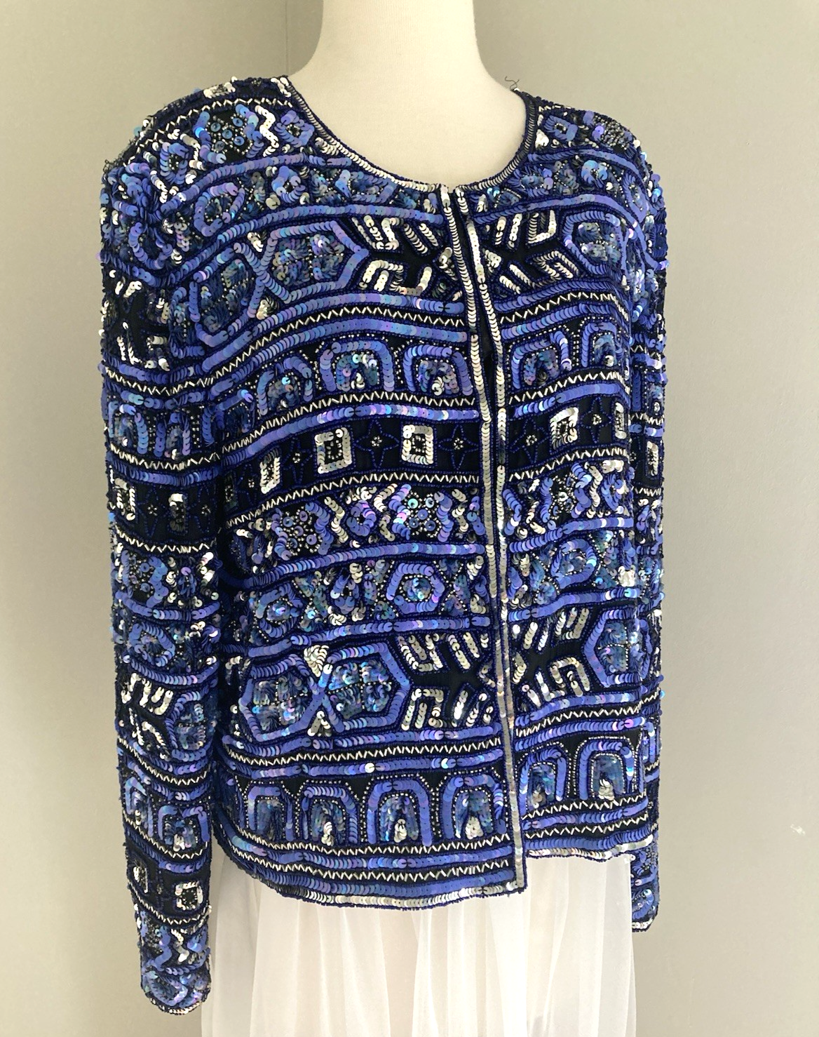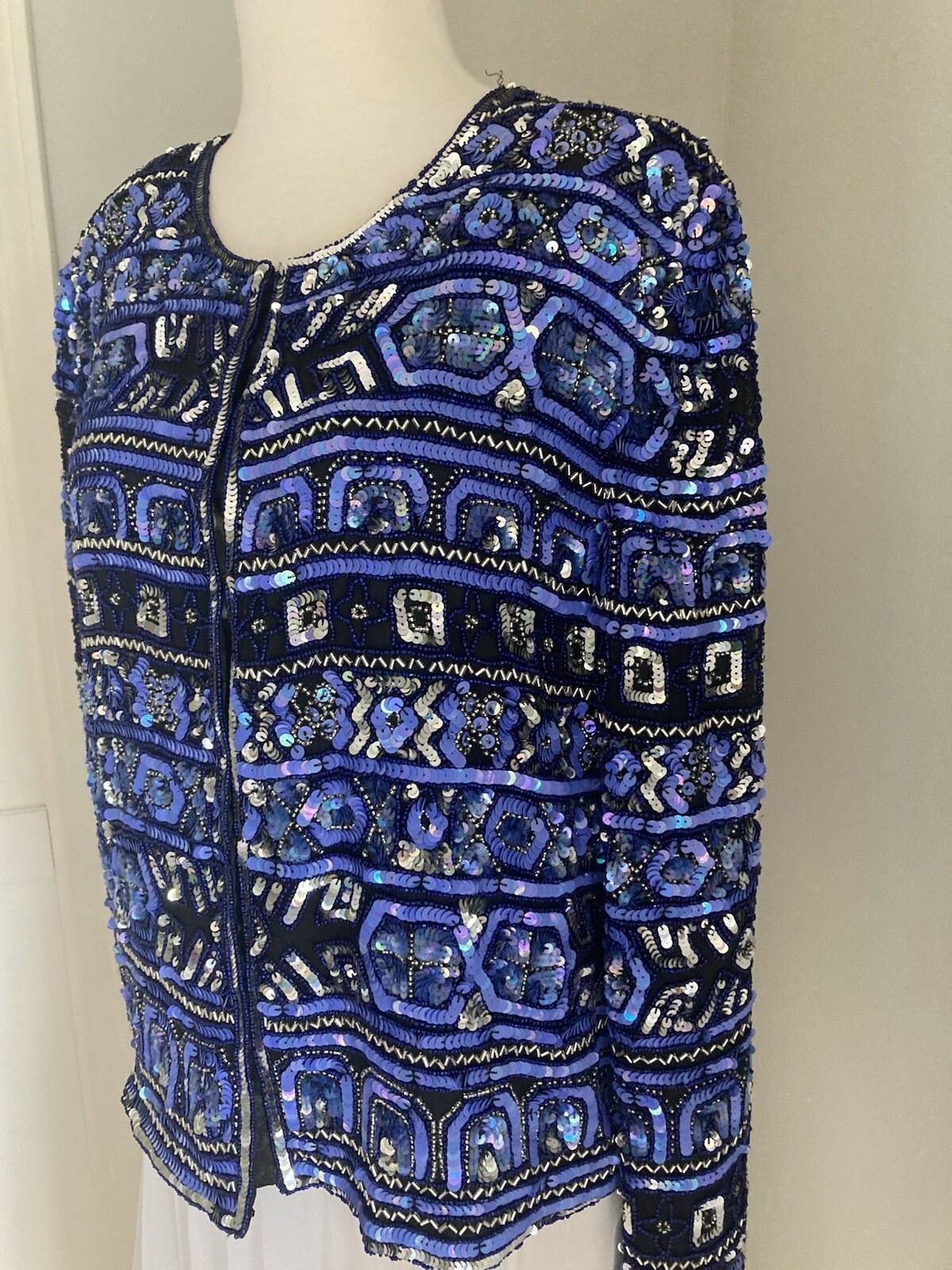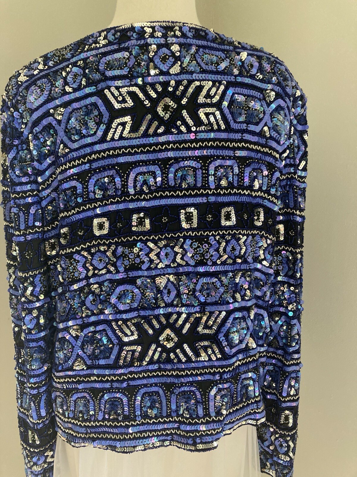 1980s Vtg Adrianna Papell Sequins Beads SILK Jacket Blue Purple Bling! Large
