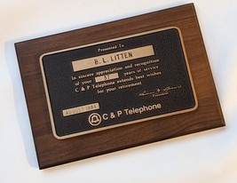 A vendre est un telephone C P Telephone d'occasion en août 1984 USE 37 ans plaque murale en bronze a la retraite. La plaque mesure 9,75 x 6,75 pouces.