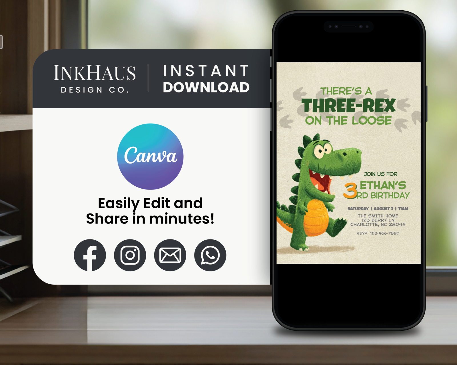 Editable T-Rex Birthday Invitation – Cute Dinosaur Party Invite Template, Kids Birthday Digital Download for Boys or Girls, Canva Template