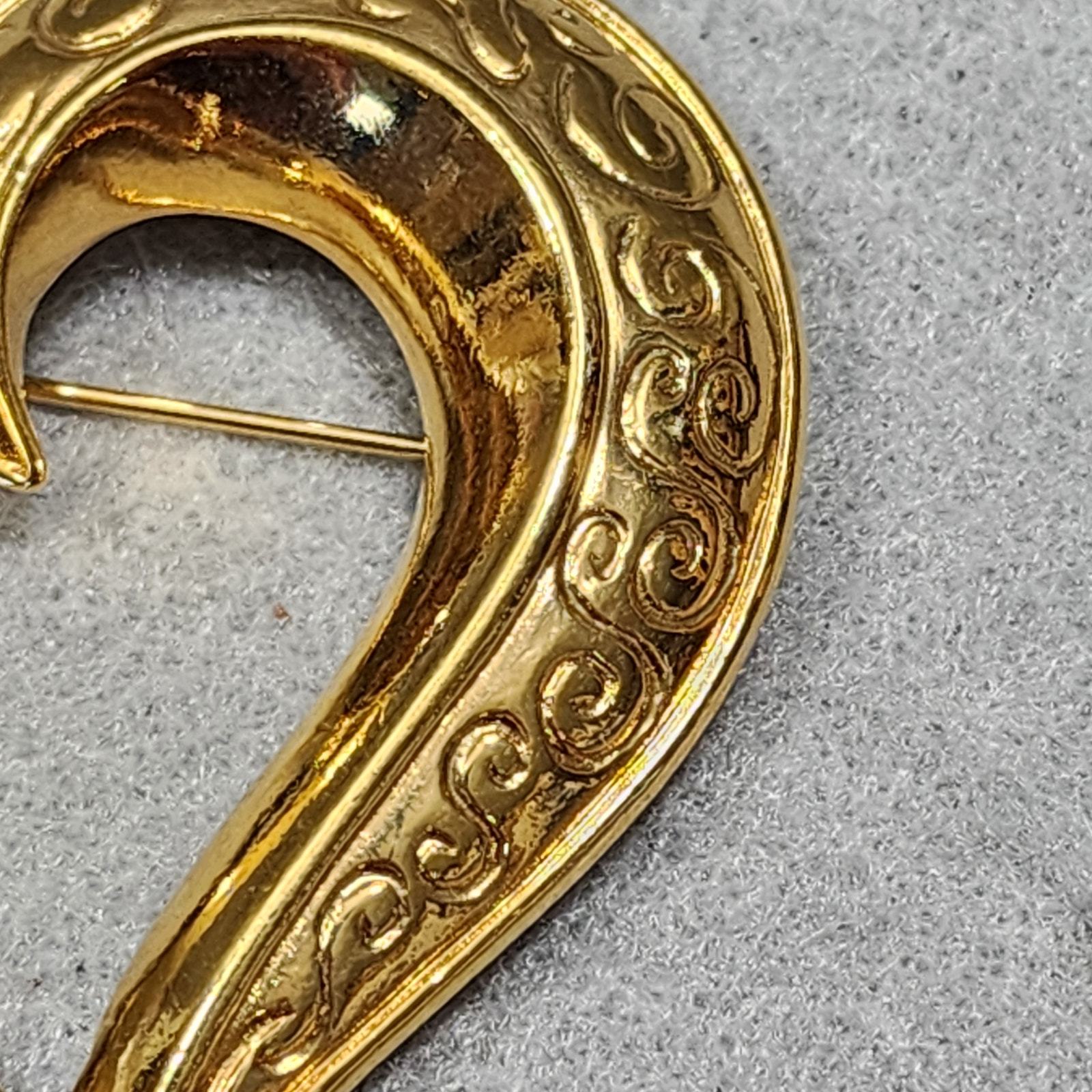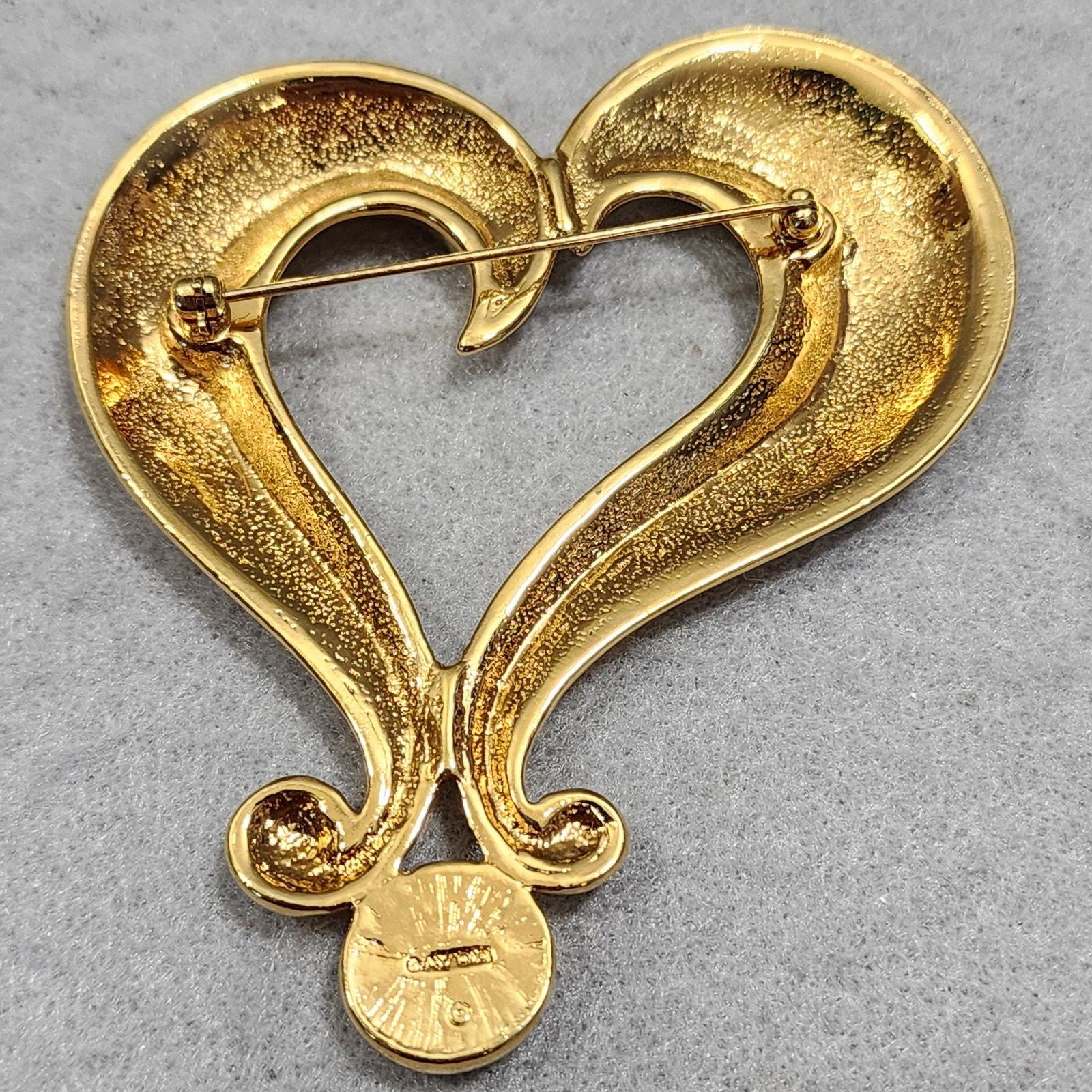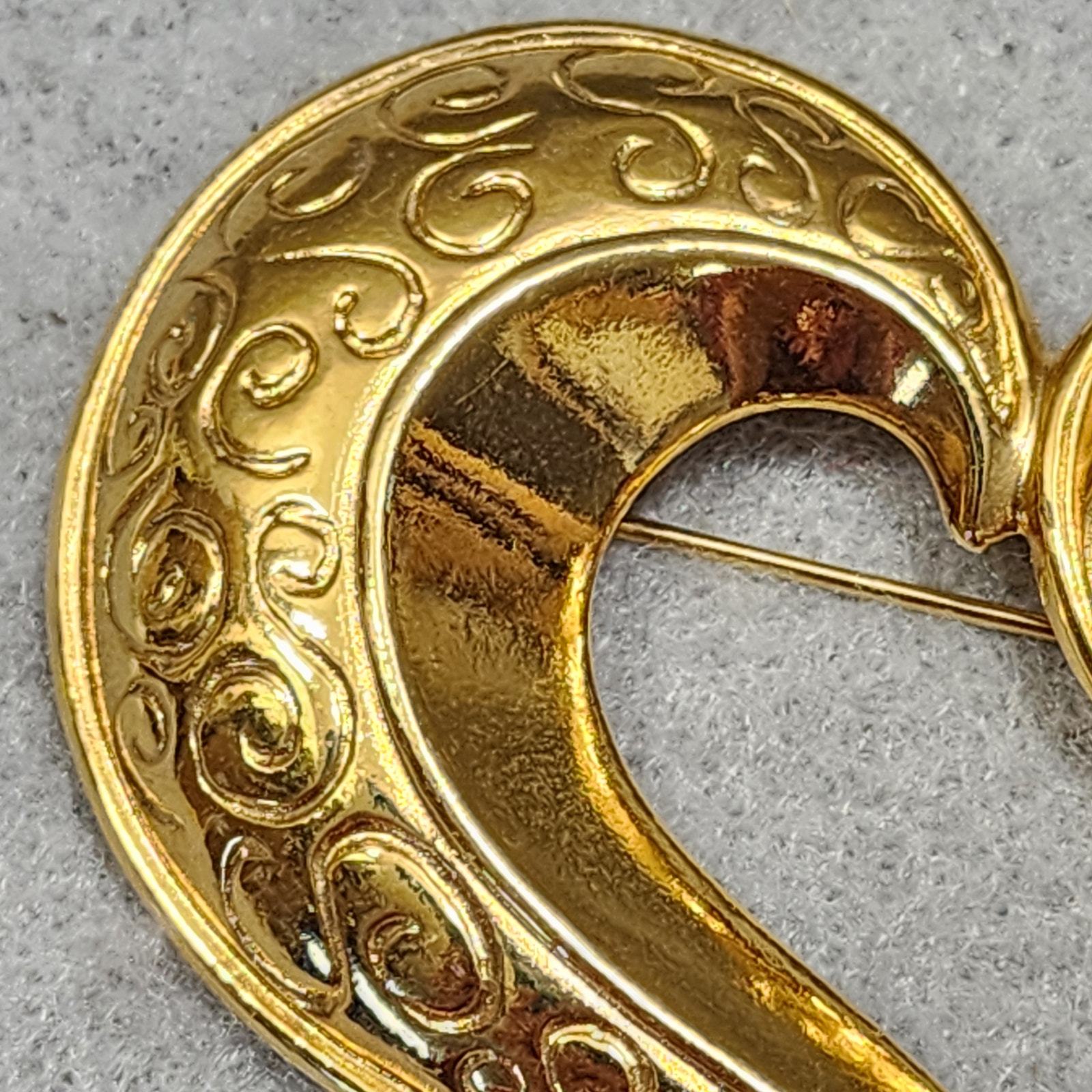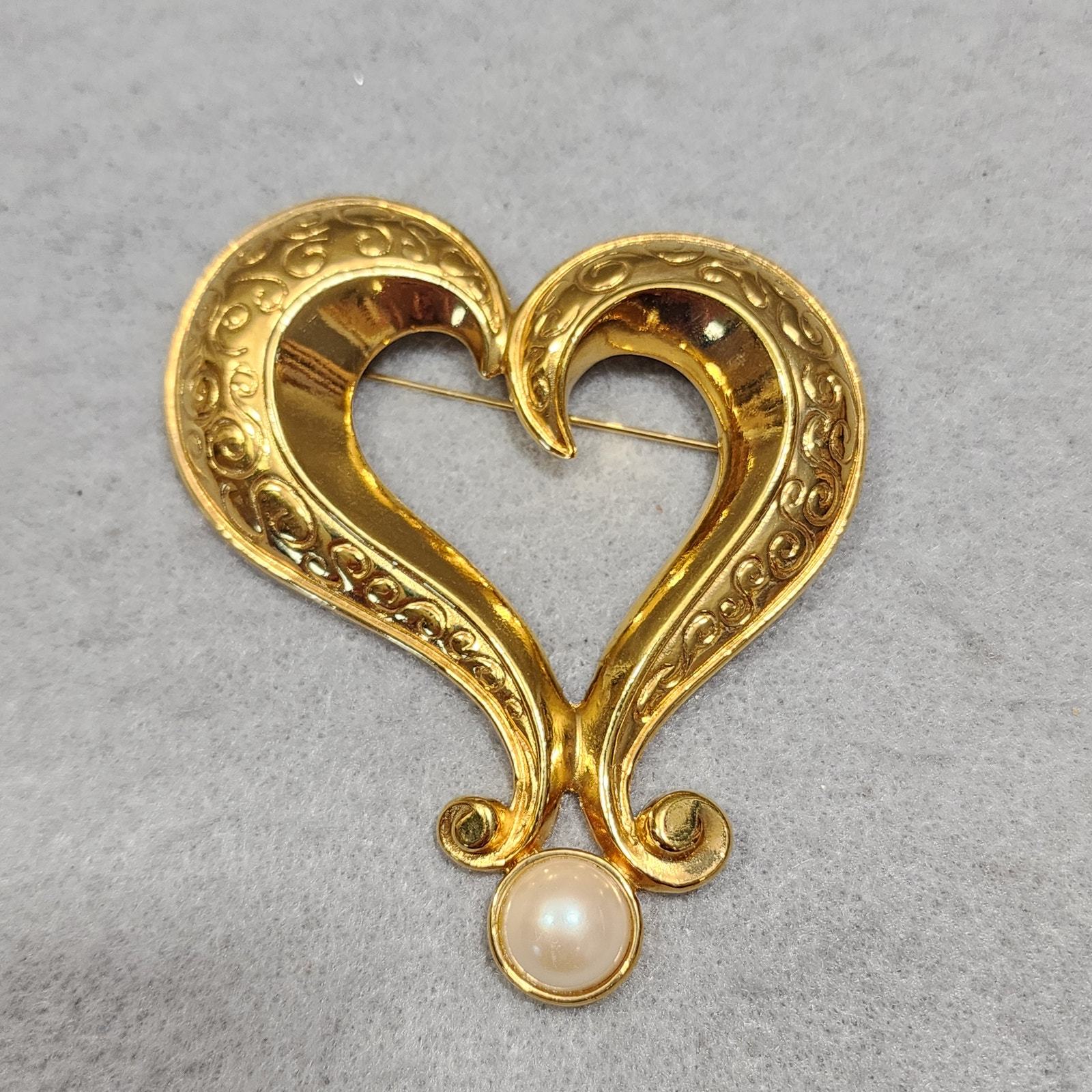 Vintage 1980s MCM Signed Avon Gold Tone Faux Pearl Ornate Etched Scrolling Details Open Swirl Heart With Faux Pearl Drop Accent Brooch Pin