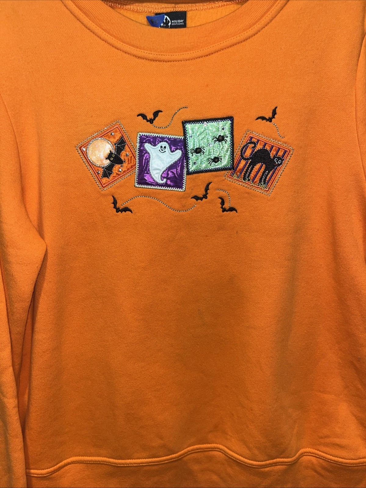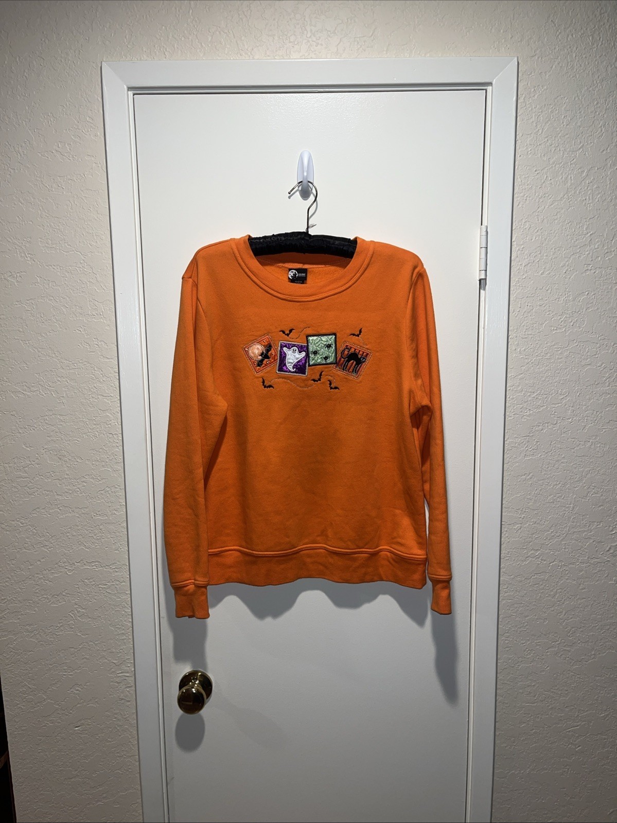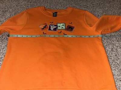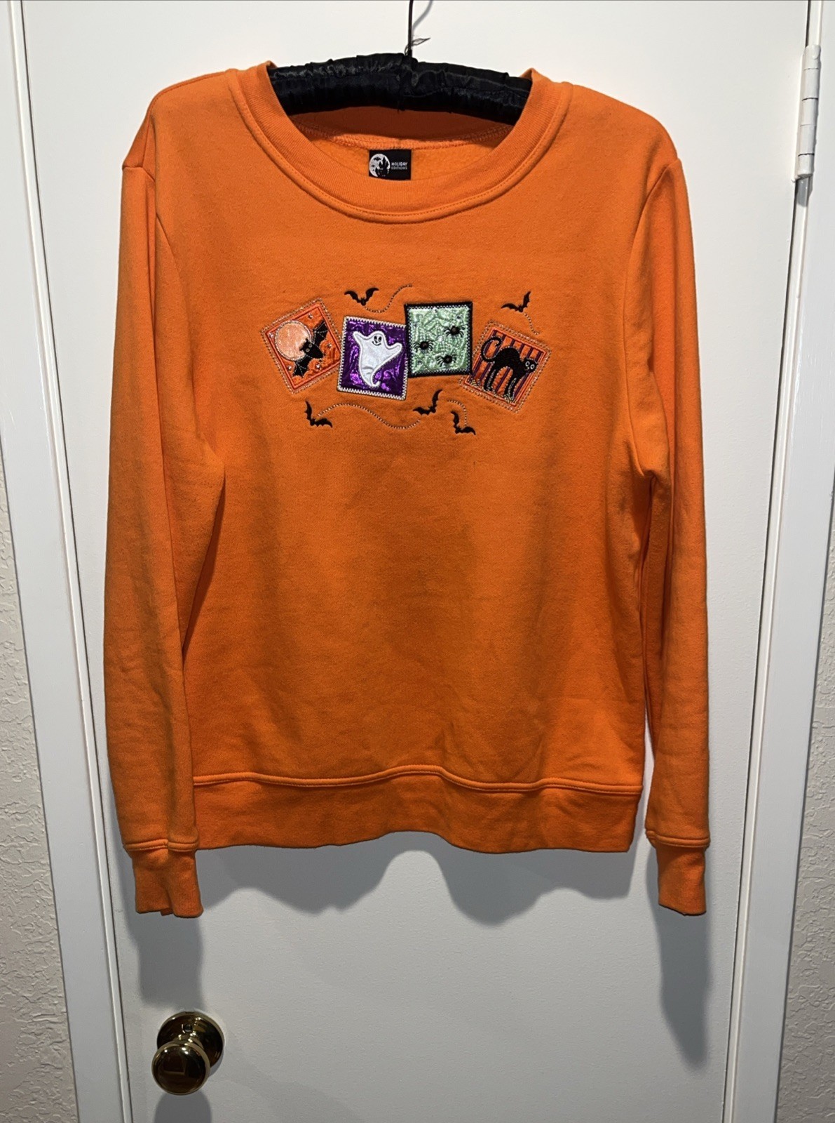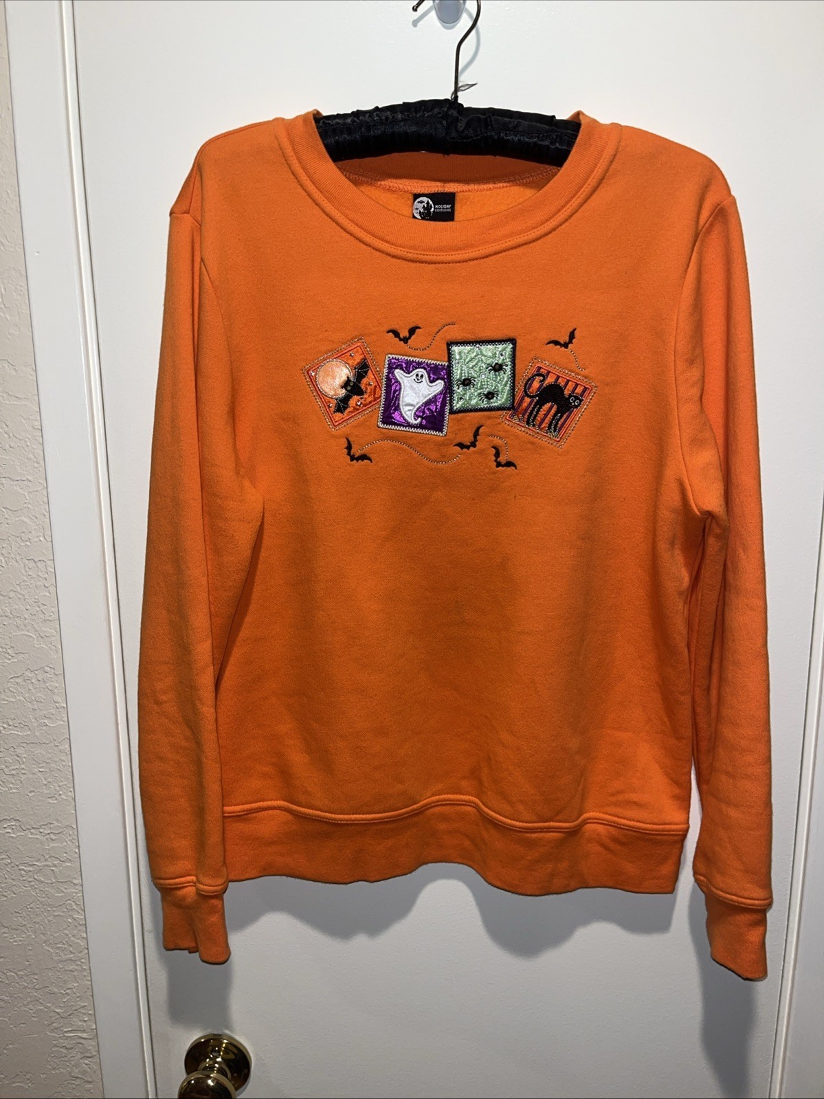 The Holiday Editions Halloween Women's Pullover Sweatshirt in size small features a fun Halloween theme with bat, ghost, cat, and spider embroidery. This vintage-inspired sweatshirt in orange color is perfect for activewear, with a regular fit and machine washable cotton blend fabric. The pullover style and regular size make it a comfortable and stylish choice for women looking to add a festive touch to their wardrobe.