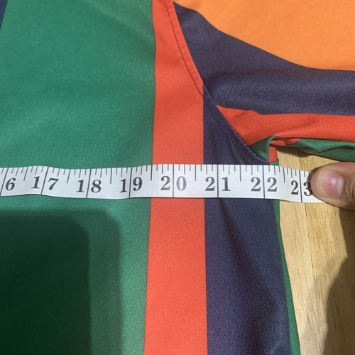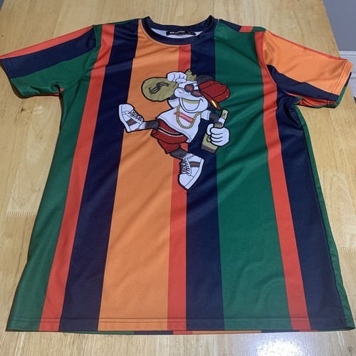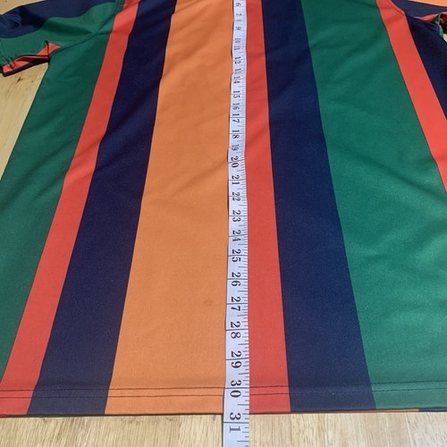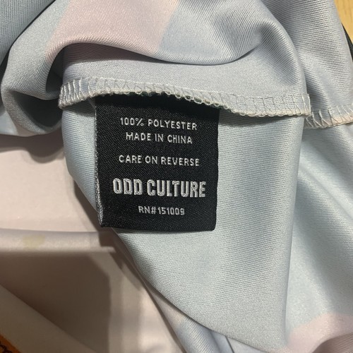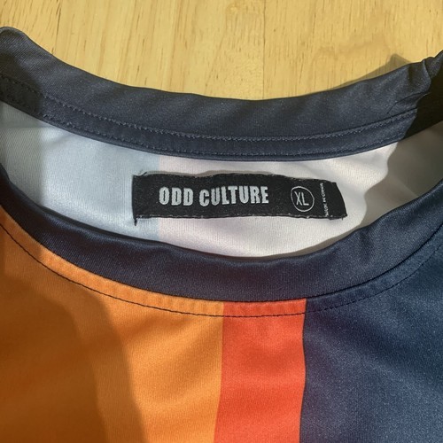 This Odd culture men's T-shirt comes in a size XL with a crew neck and short sleeves. The shirt features a striped pattern with a colorful vertical color block design and the brand's logo on the front. Made from polyester jersey fabric, this relaxed-fit shirt is perfect for any casual occasion. Whether you're out with friends or running errands, this shirt will keep you comfortable and stylish all day long.