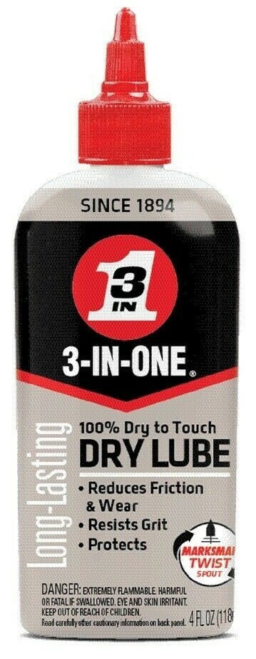 FOR SALE IS ONE (1) NEW BOTTLE OF 3-IN-ONE LONG LASTING DRY LUBE 4 ounce BOTTLE WITH MARKSMAN TWIST SPOUT by 3 IN ONE BRAND MPN 12002 UPC# 079567120025. 3-IN-ONE LONG LASTING DRY LUBE REDUCES WEAR AND FRICTION ON YOUR TOOLS AND EQUIPMENT. PLUS, IT PROTECTS METAL PARTS TO KEEP YOUR TOOLS AND EQUIPMENT IN BETTER WORKING ORDER. GOES ON AS A LIQUID AND IS QUICKLY, 100% DRY TO TOUCH, PROTECTS AGAINST CORROSION, RESISTS GRIT, WILL NOT ATTRACT DIRT OR DUST. THIS LONG LASTING LUBRICANT NOW FEATURES THE MARKSMAN TWIST SPOUT WITH PRECISE APPLICATION WHEN AND WHERE YOU WANT IT. JUST TWIST FOR OPEN AND TWIST FOR CLOSED. 3-IN-ONE DRY LUBE PROVIDES SUPERIOR LUBRICATION AND LONG LASTING CORROSION PROTECTION WITHOUT OILY RESIDUE. THE QUICK DRYING FORMULATION IS IDEAL FOR USE ON BLADES, BITS, ROLLERS, CHAINS, CIRCULAR SAW BLADES, TOOLS AND MORE. YOU WILL RECEIVE ONE (1) BOTTLE OF 3-IN-ONE DRY LUBE WITH MARKSMAN TWIST SPOUT SHIPPED BY USPS.....