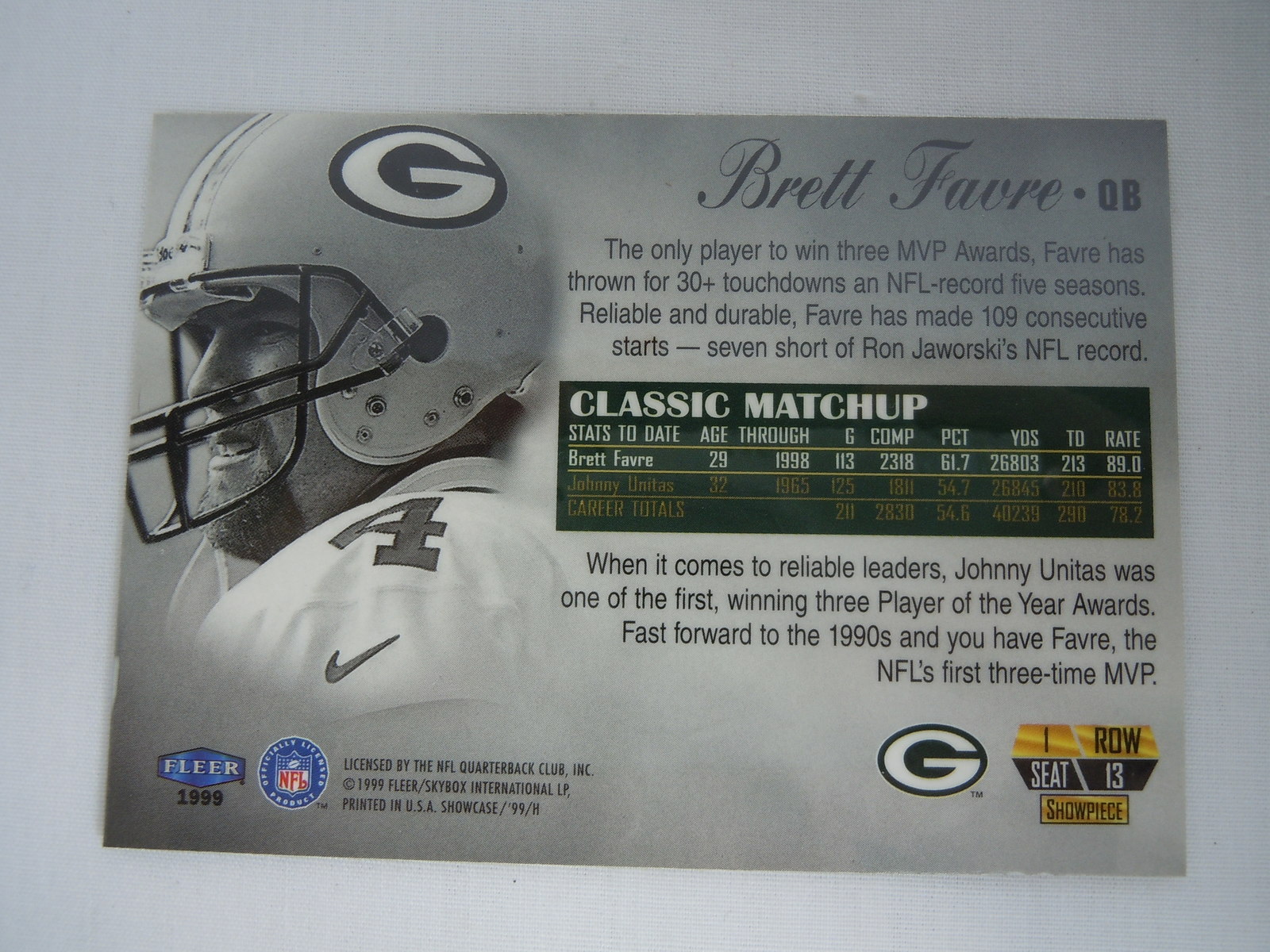 This is a nice example of a 1999 Flair Showcase #13 Brett Favre .Other important information about this card: In 1999 Brett Favre played for the Green Bay Packers.Please check out our other listings for more great cards.