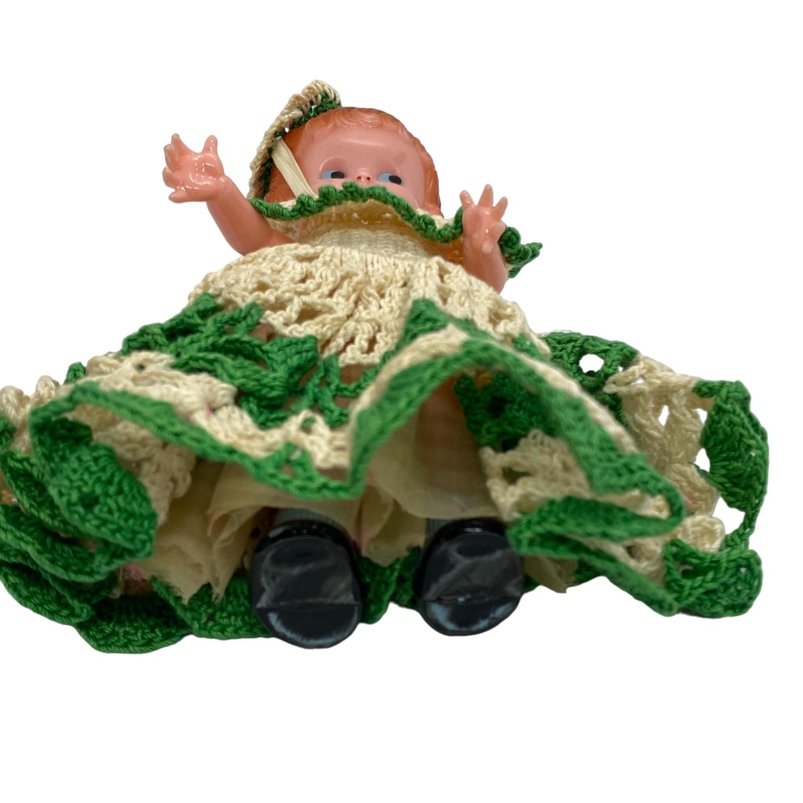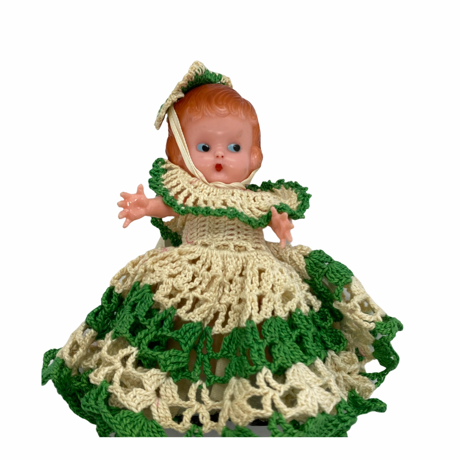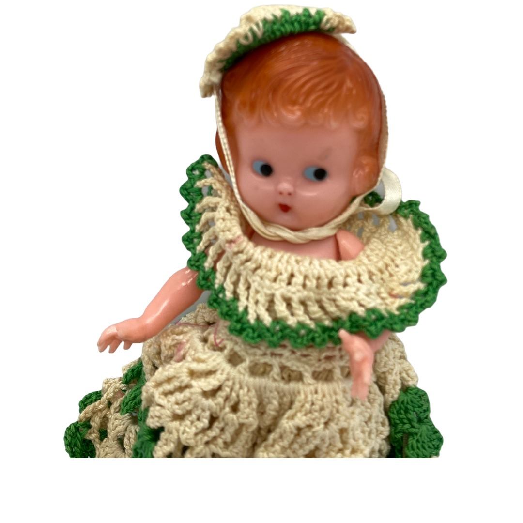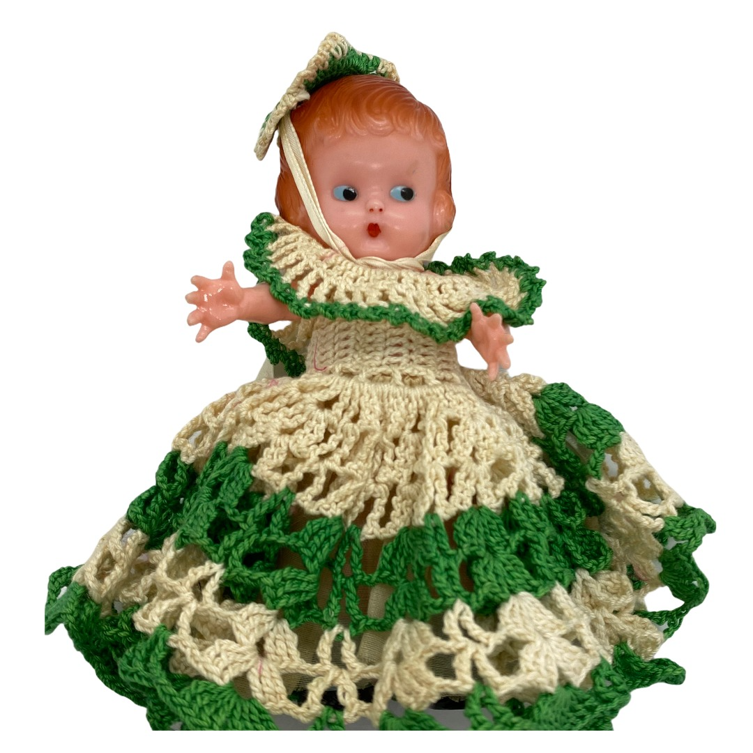 Kewpie Style Vintage Doll in White and Green Crochet Dress