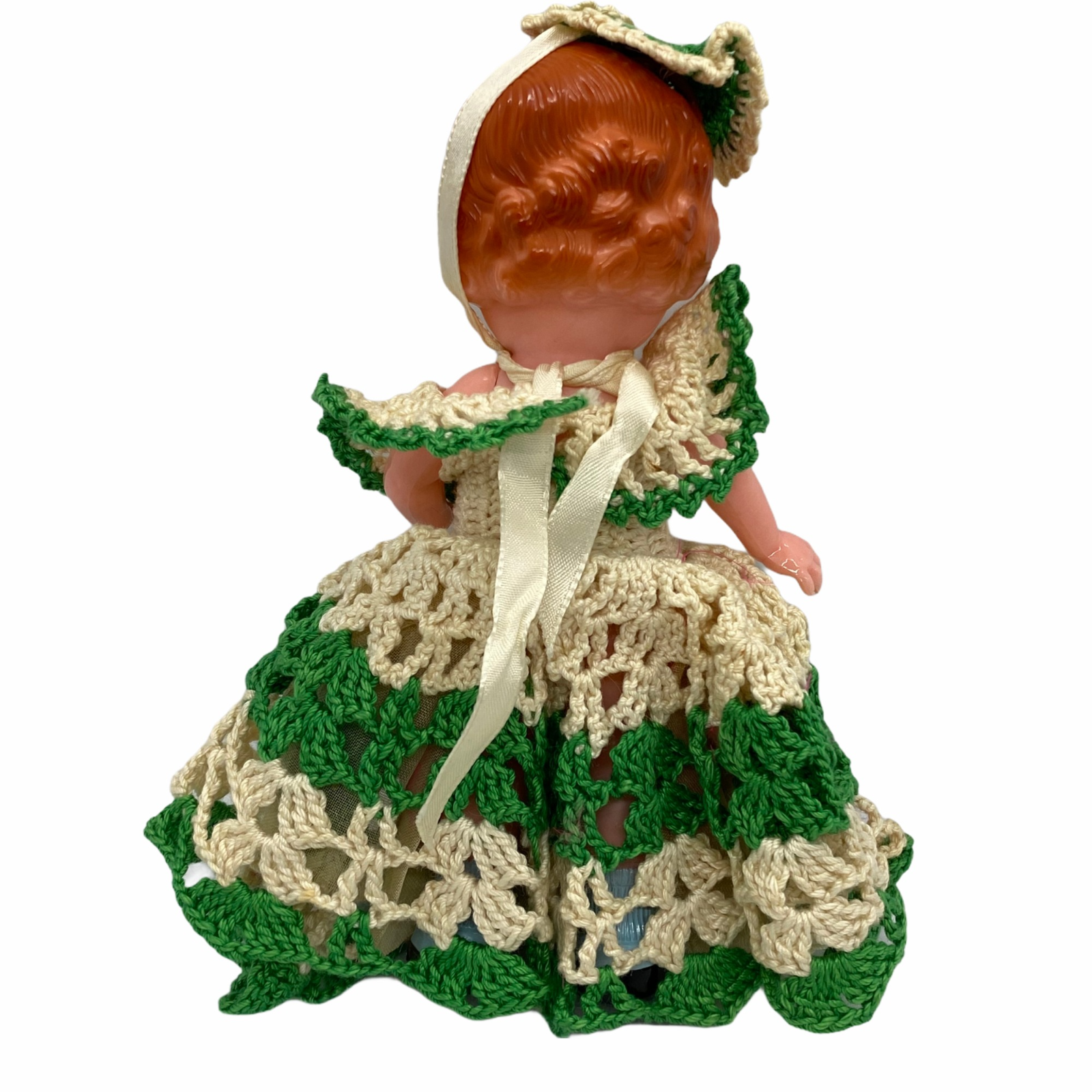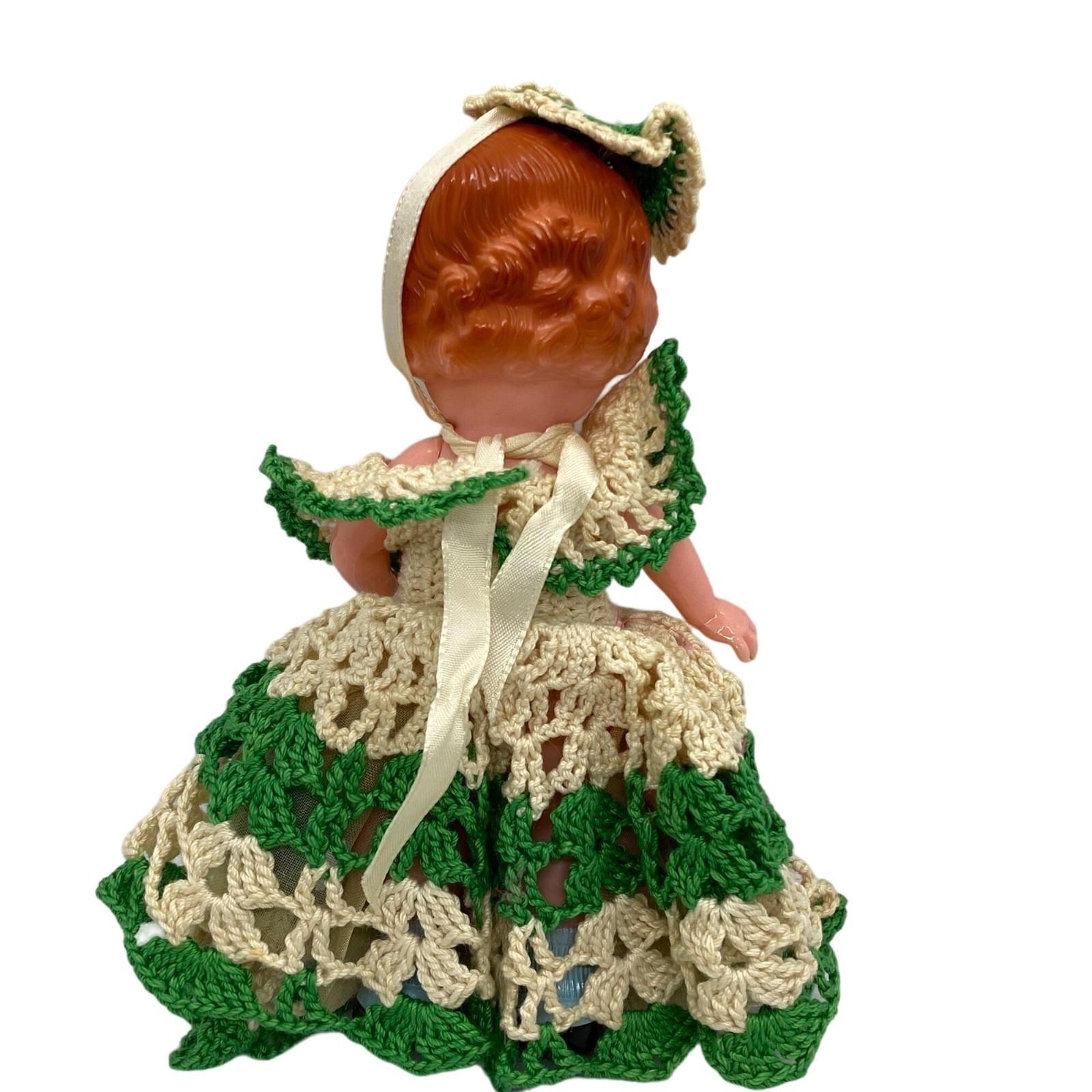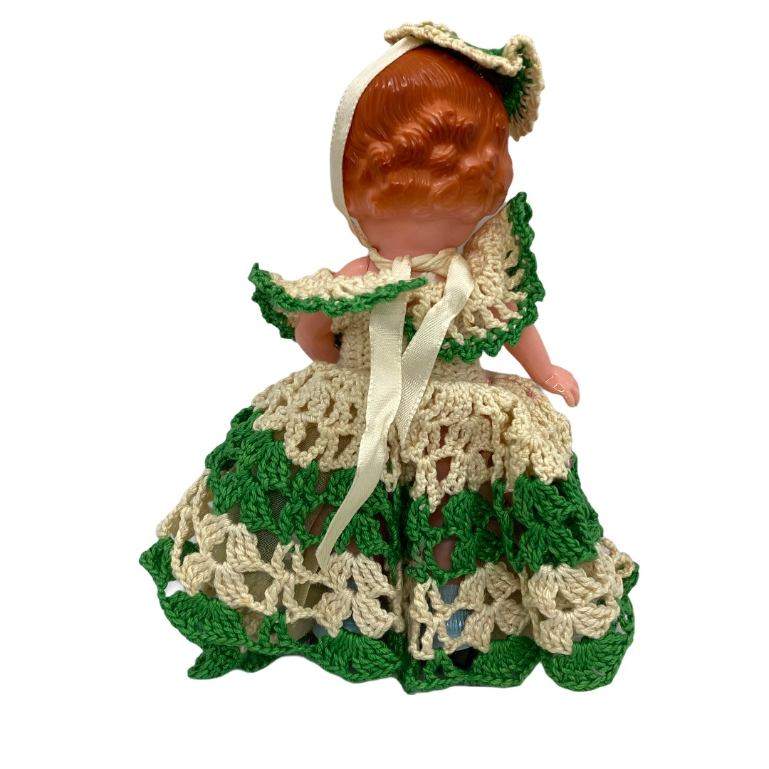 Kewpie Style Vintage Doll in White and Green Crochet Dress