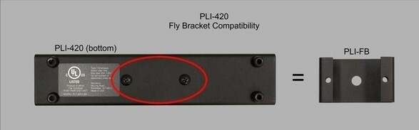 Whirlwind PL1-FB fly bracket for mounting on PL1 Powerlink Stringer Boxes. This is the center mounting bracket that has the screws on the bottom of the box. Box and clamp not include, (bracket only).
