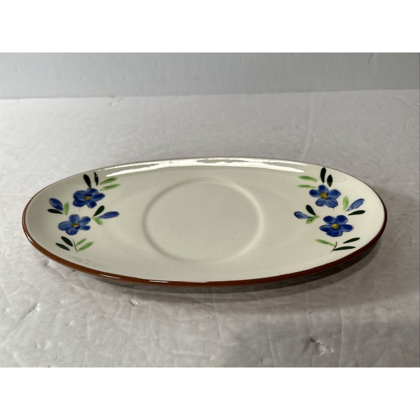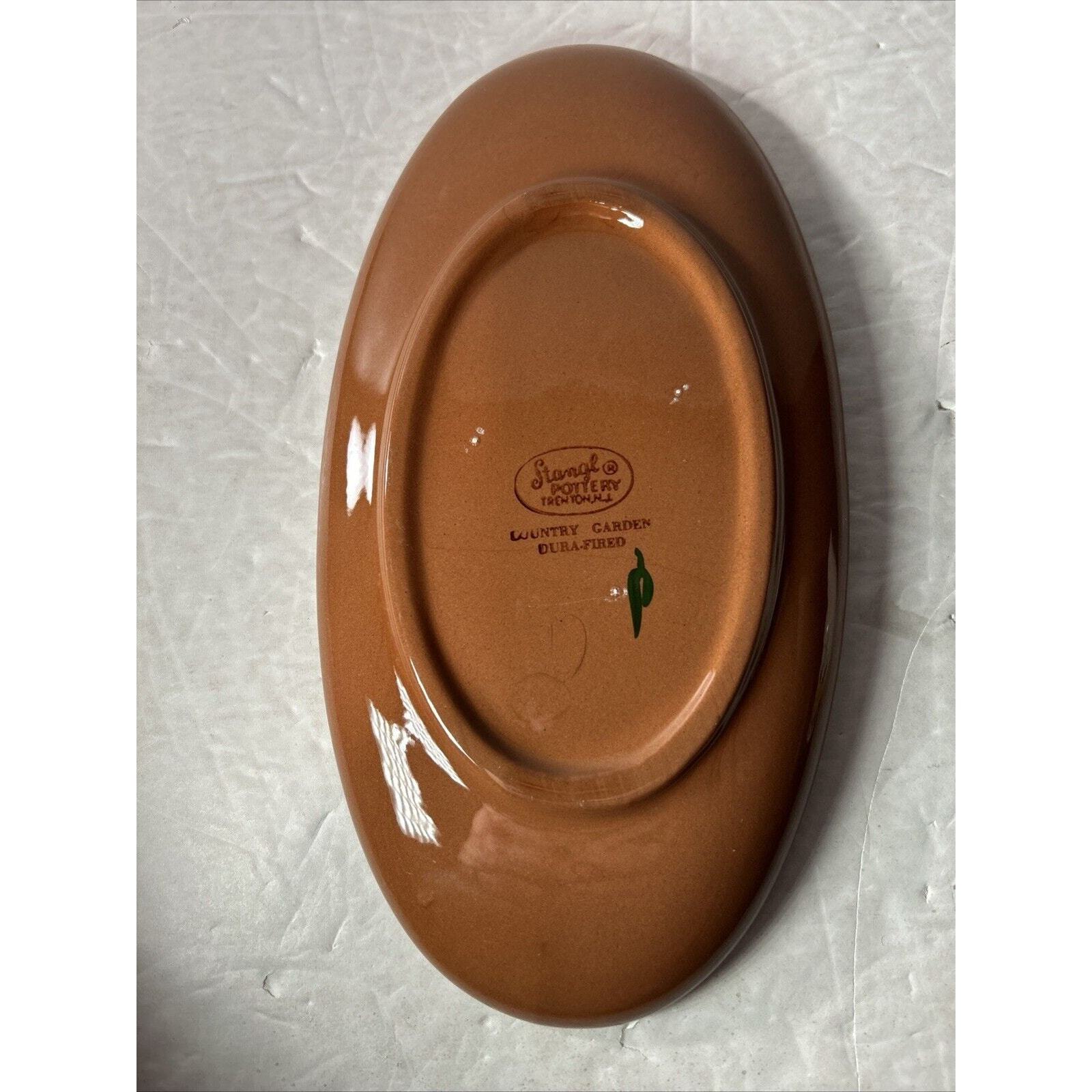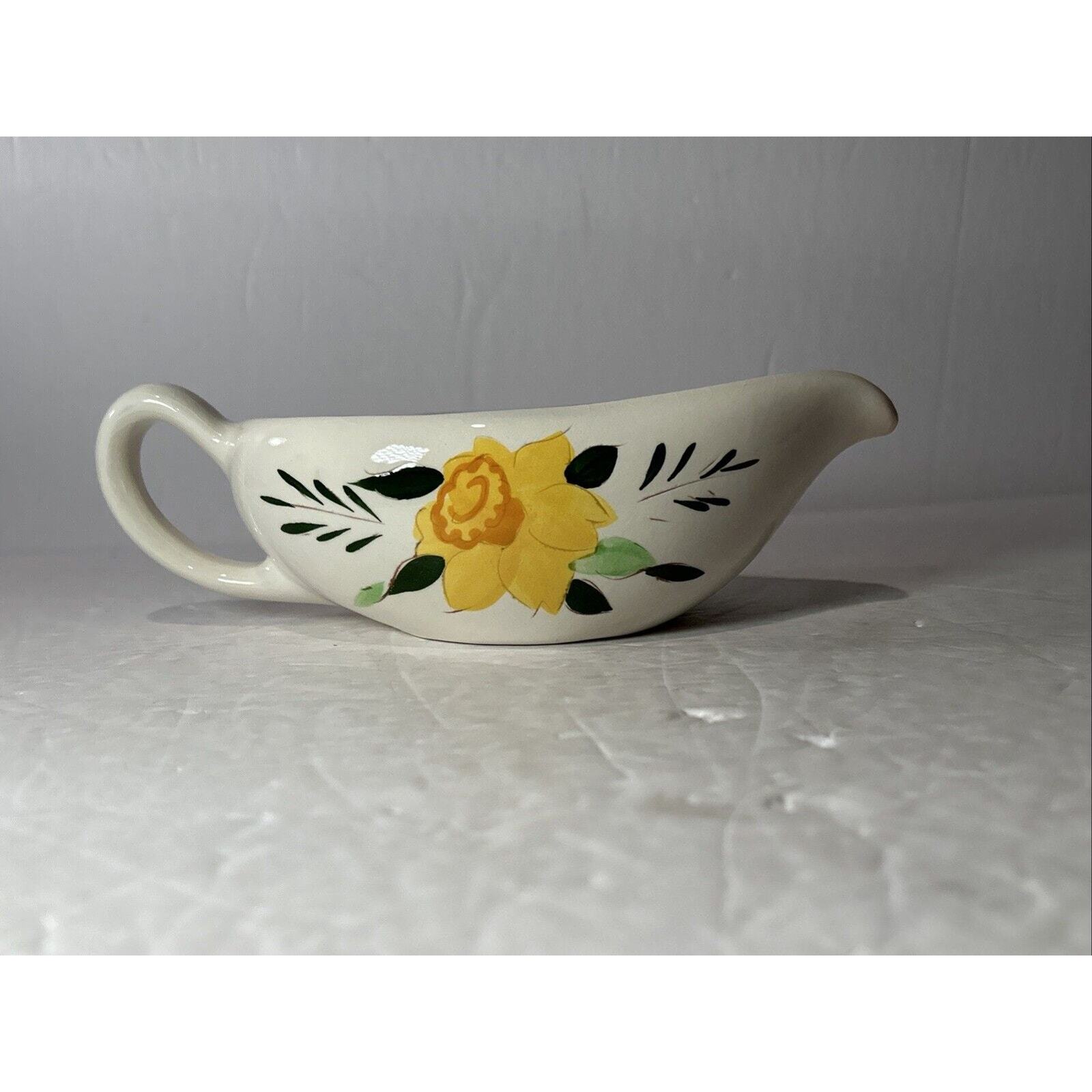 This vintage Stangl Pottery ?Country Garden? gravy boat with matching underplate is a charming addition to any table or collection. Produced in the USA between 1950 and 1967, this hand-painted set features bright yellow flowers with blue and green accents on warm terra cotta clay.