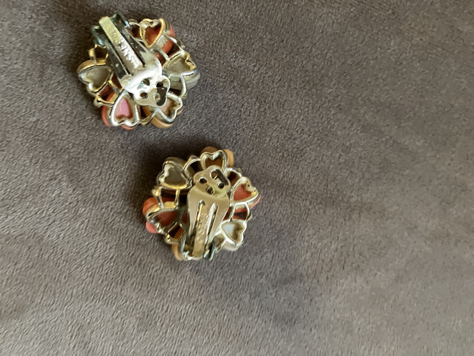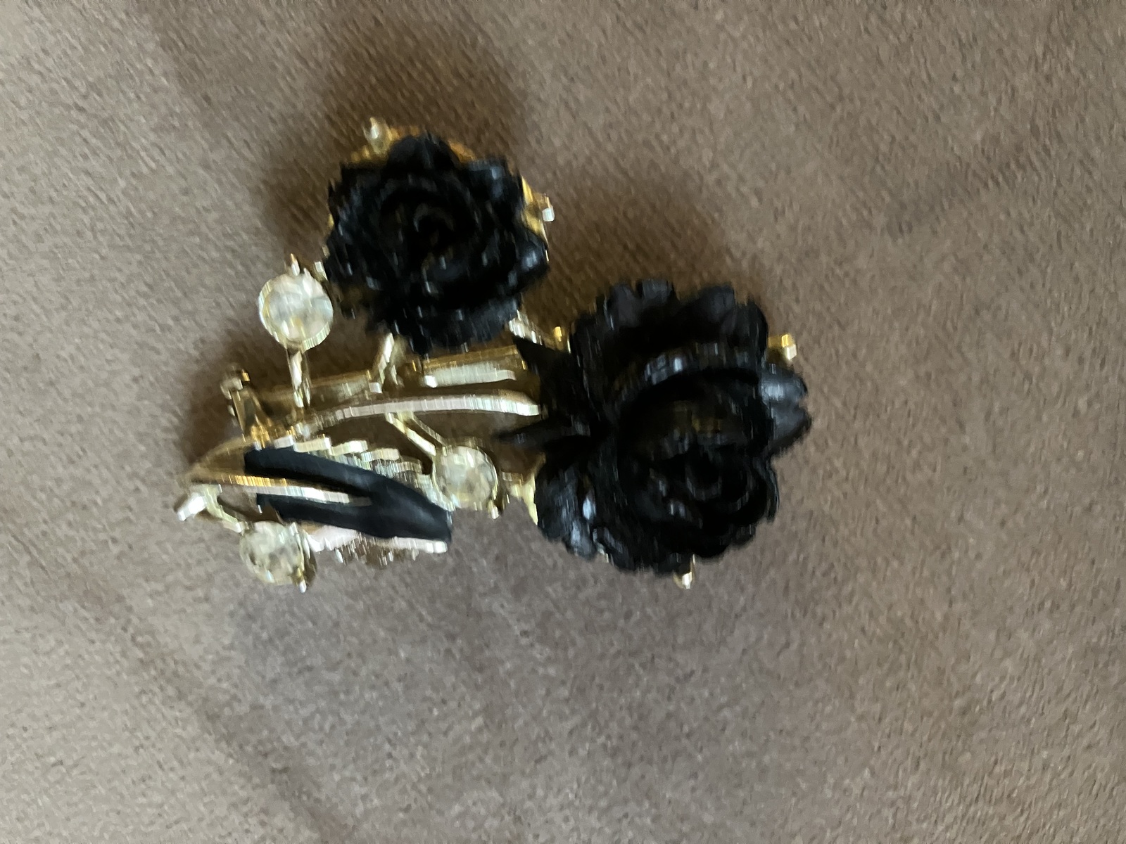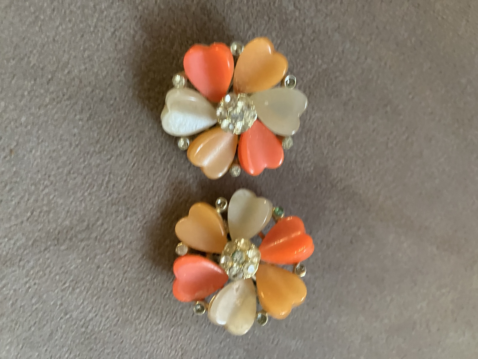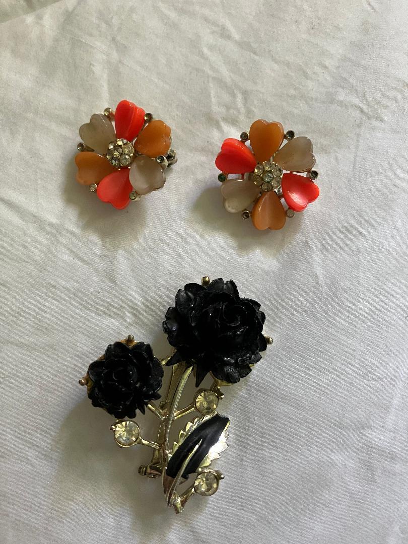 Straight from back-in-the-day, these vintage jewelry pieces are both fun and totally wearable. Clip earrings feature coral, gold and cream petals with rhinestone embellished centers and measure 1" in diameter. The brooch has a locking pin back and gold-toned embellishments. Flowers are black and are set off by rhinestone buds on each stem.