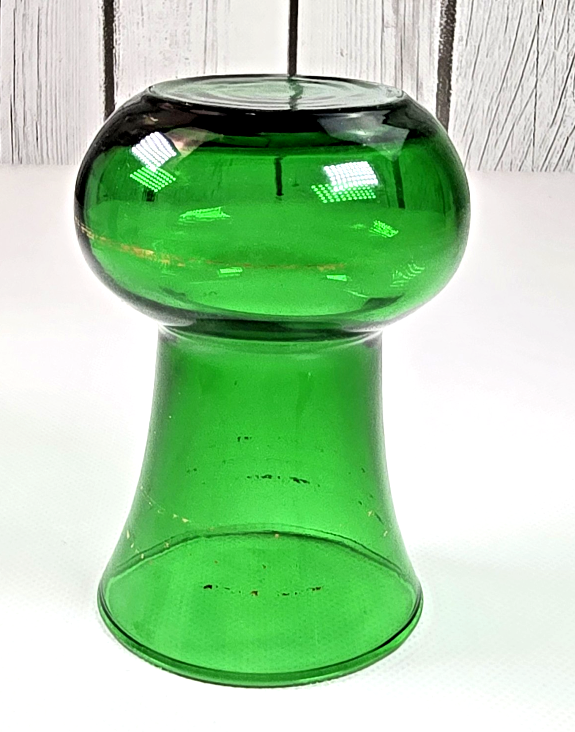 This vintage Anchor Hocking bud vase features classic forest green glass in a compact 3.75-inch size. Perfect for single stems or small floral displays, it adds a charming mid-century touch to any windowsill, shelf, or table.