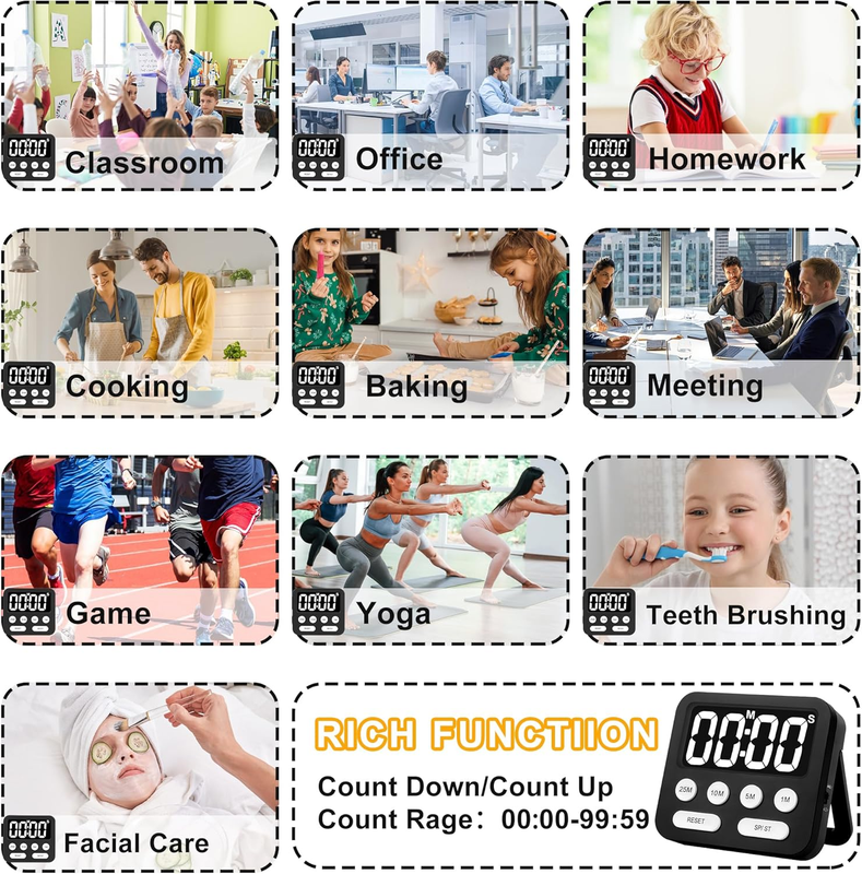Extensive Uses: Our kids timer with large LED displays are suitable for a wide variety of applications, such as kitchen, gym, toilet, etc.You can use them for tasks, workouts, showers, etc.Not only is it an adhd timer, it's also a handy home timer.