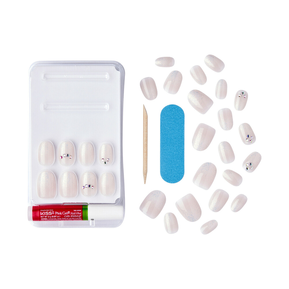 Kit contains 30 fake nails, pink gel nail glue (2g / 0.07 oz.), mini file, manicure stick
