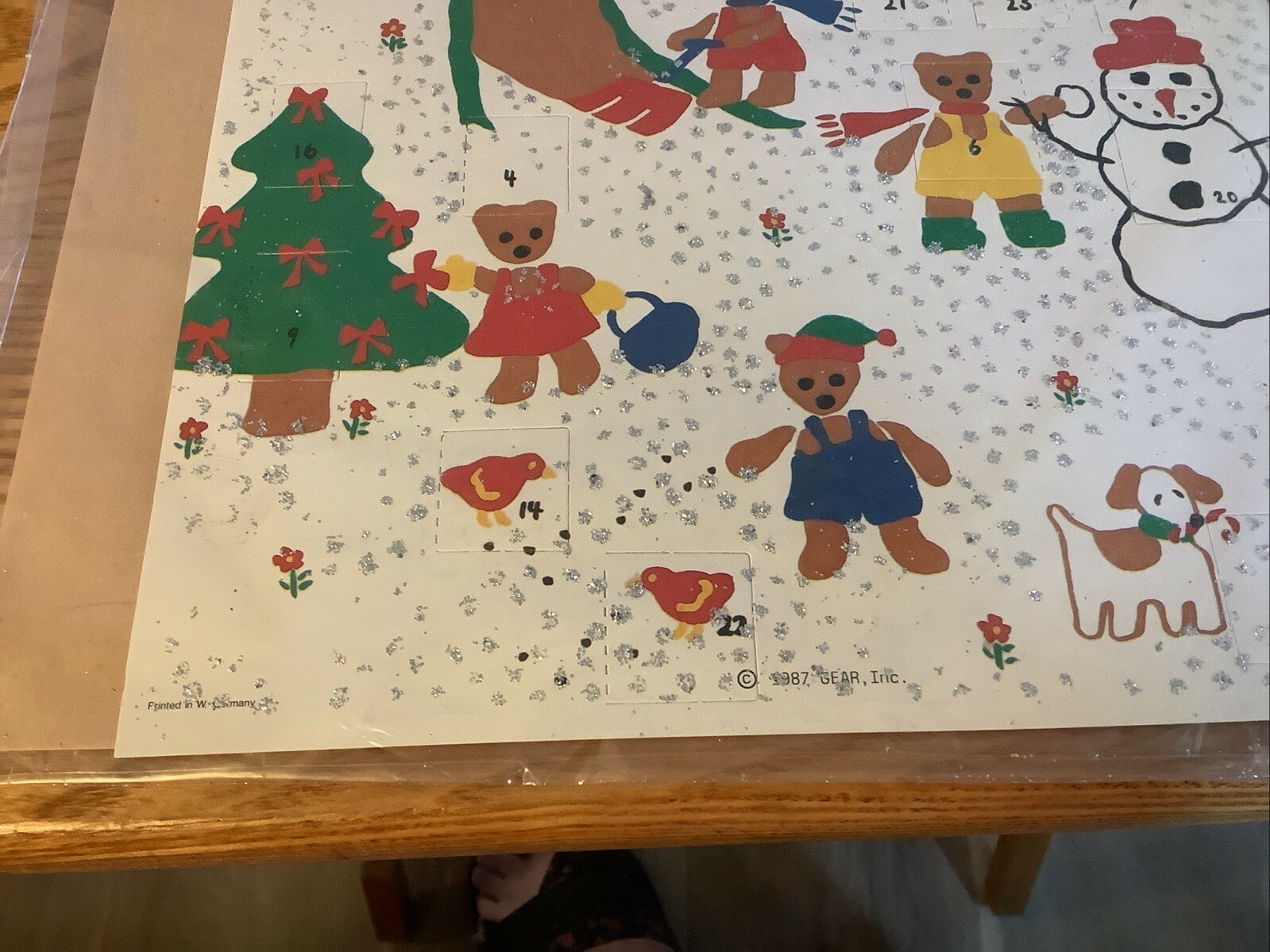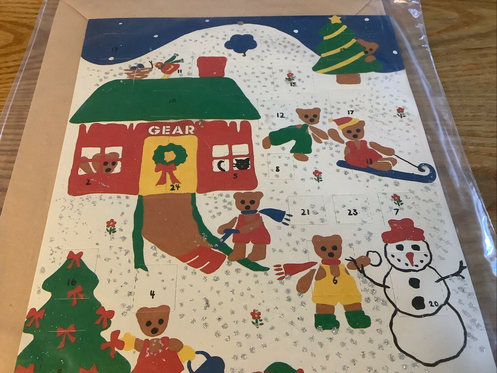 Vintage German advent calendar from 1987. Scene is bears playing in the snow. Has 24 numbered doors and comes with a large envelope for mailing or storage. Measures 8 inches wide and 11 3/4 inches tall. Feel free to email with questions. I do combine shipping on multiple items. Have a great day!