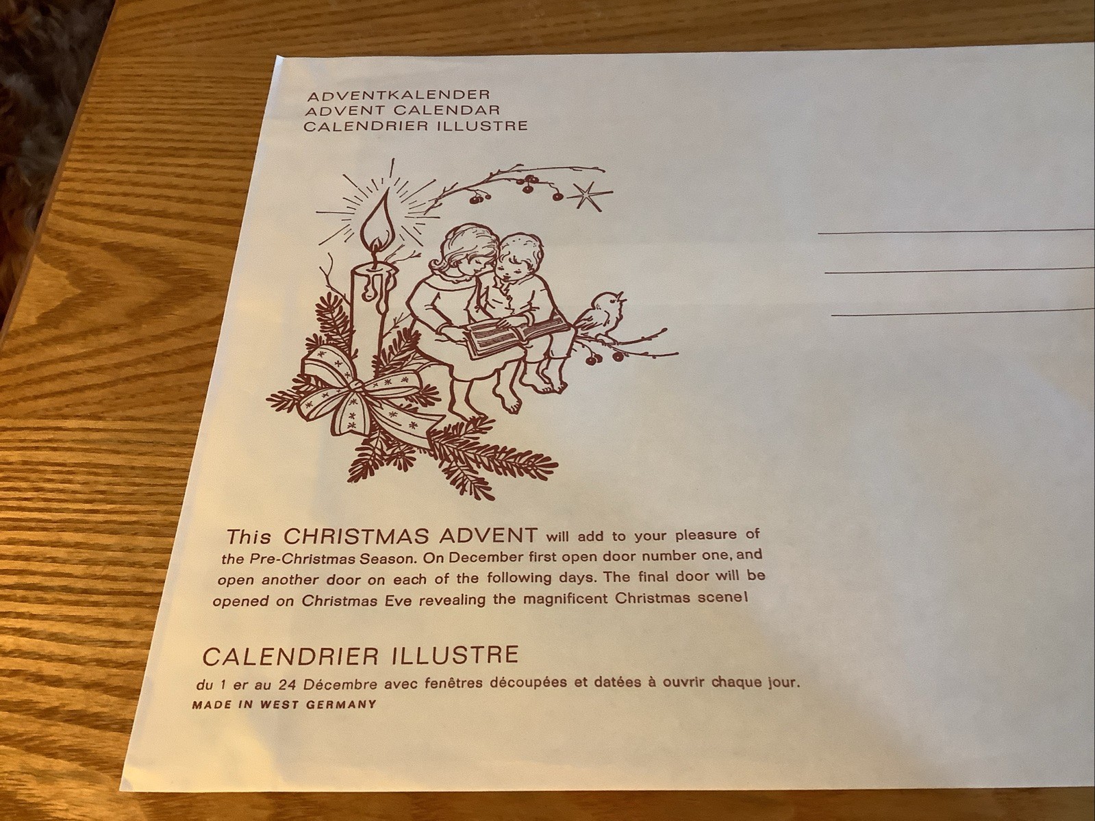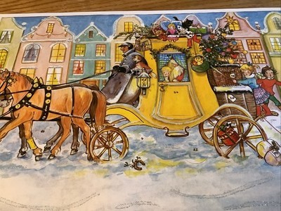 Paper advent calendar with a decorated carriage with Santa and happy children. Made in West Germany and at least 30 years old. Measures 11 1/2 inches wide and 8 inches tall. Comes with an envelope for mailing or storage. New, but package is open. Feel free to email with questions. I do combine shipping on multiple items. Have a great day!