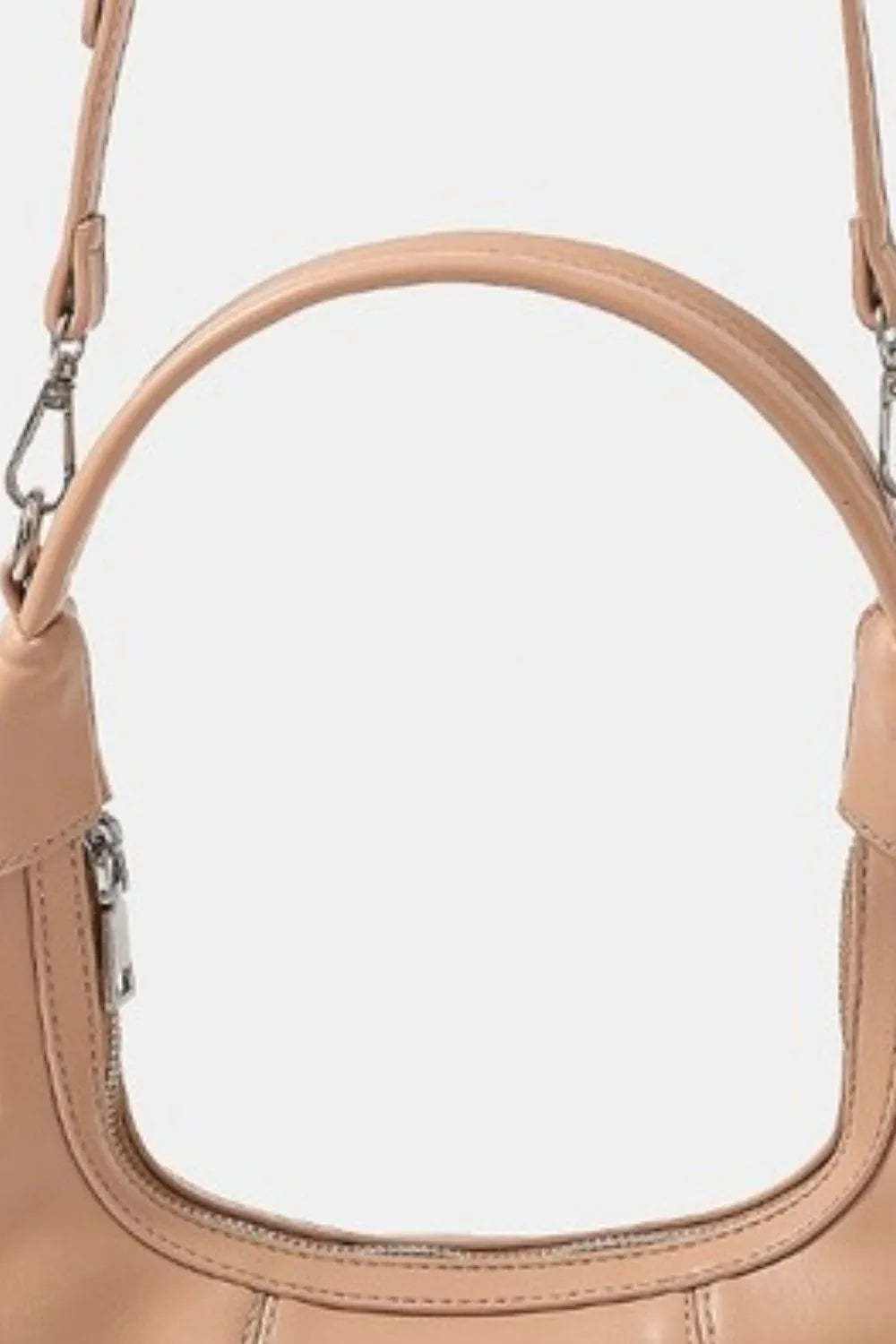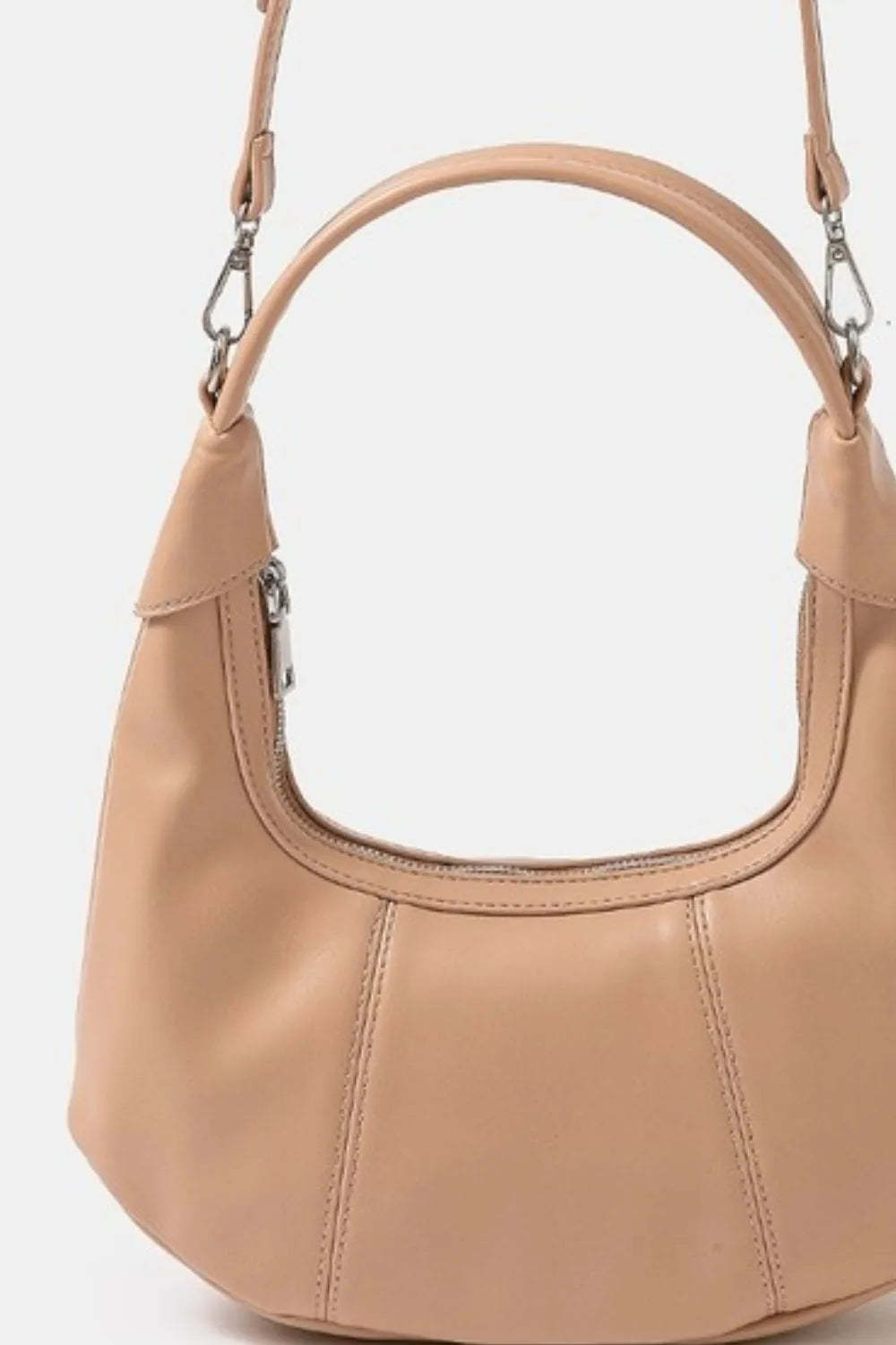 This sophisticated crossbody bag features premium soft leather construction in a versatile nude beige tone that complements any outfit. The convertible design allows for both shoulder and crossbody wear with adjustable leather straps. The spacious hobo silhouette provides ample storage while maintaining an elegant profile. Crafted with attention to detail, it showcases smooth leather finish, silver-tone hardware, and a structured curved handle for comfortable carrying. Perfect for the modern woman who values both style and functionality, this bag transitions seamlessly from day to evening wear.