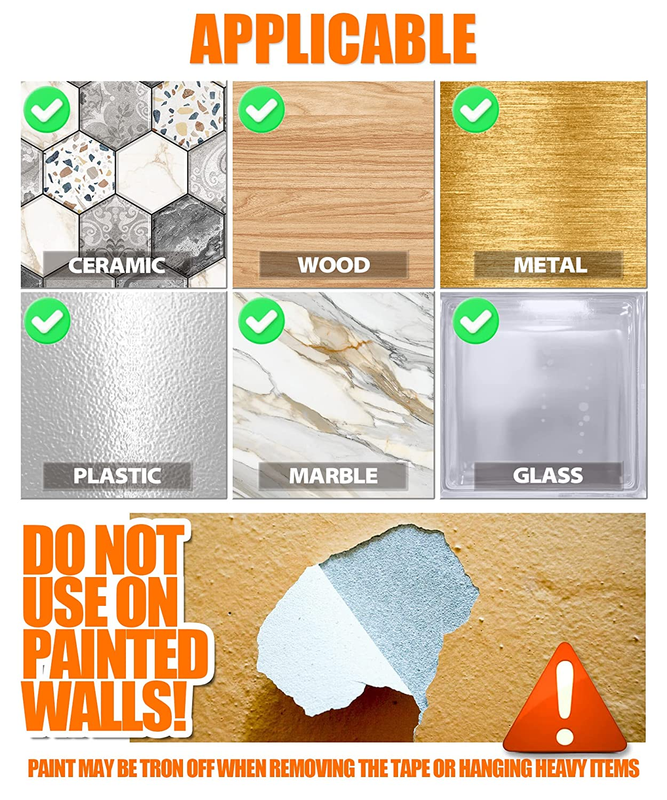???? ?? ??? - Paste tapes to the item, attach it to wherever you need, press and hold for 20 seconds, then all good! Our double-sided tape is compatible with smooth and flat surfaces, such as wood, metal, glass, plastic, marble, and ceramic. Due to the strong adhesion of our tape, DO NOT use it on painted wall or wallpaper since the cover may be torn off when removing the tape or hanging heavy items.