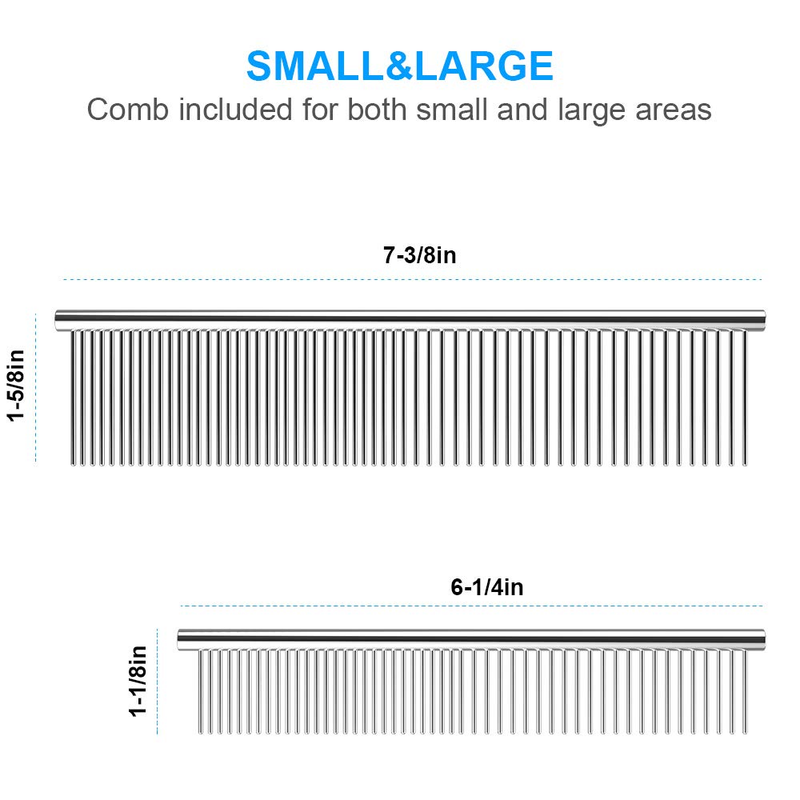? WHAT YOU GET- 2 Pack combs for removes both small large areas tangles, knots. Large comb size: 7.4 x 1.65 IN, small comb size: 6.3 x 1.2 IN.