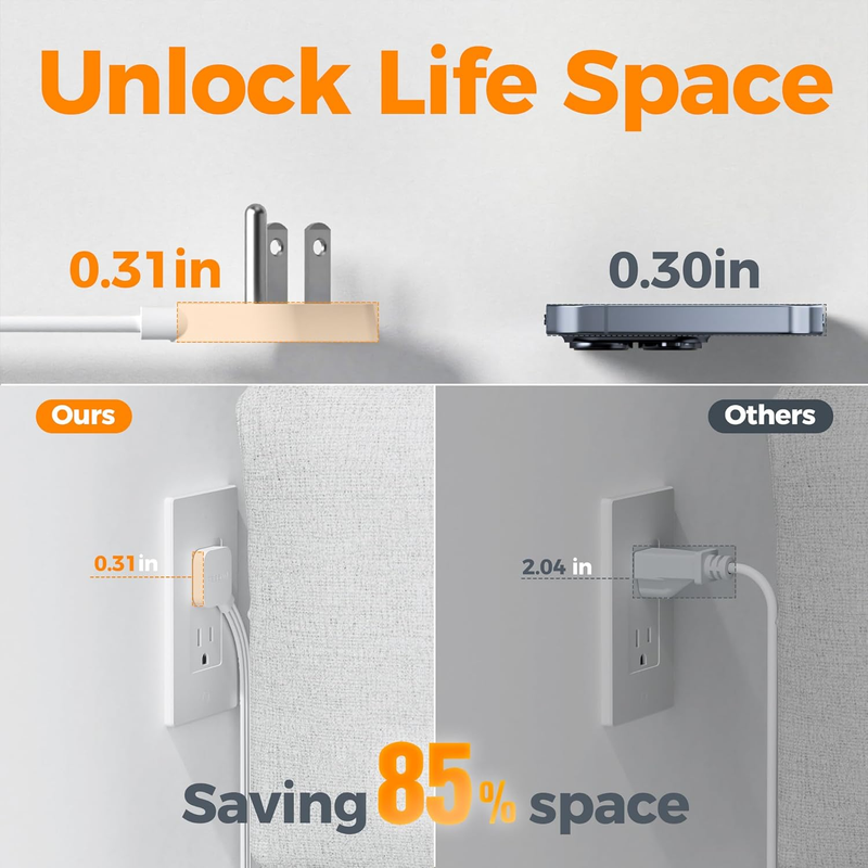 5Ft Flat Extension Cord: With only 0.31 inch flat Plug head design, flat Wall Plug can easily fit in tight spots and hide behind sofa, bed, nightstand or other furniture indoor; 45 degree right angle design create an extra space for other plug below without blocking