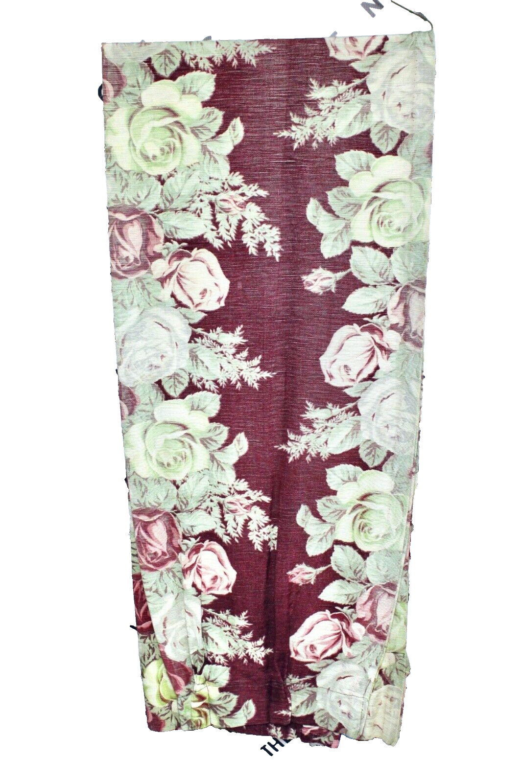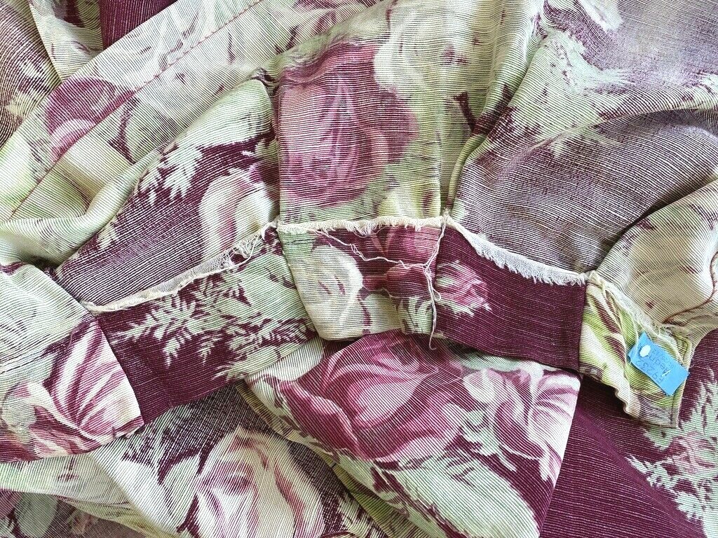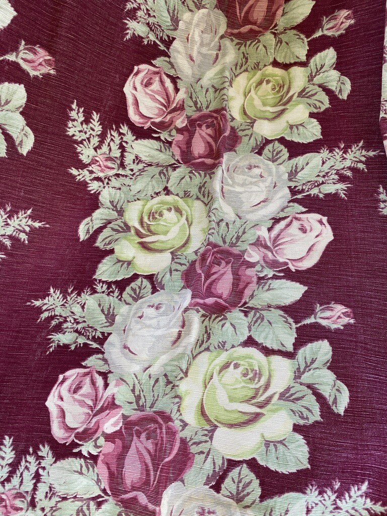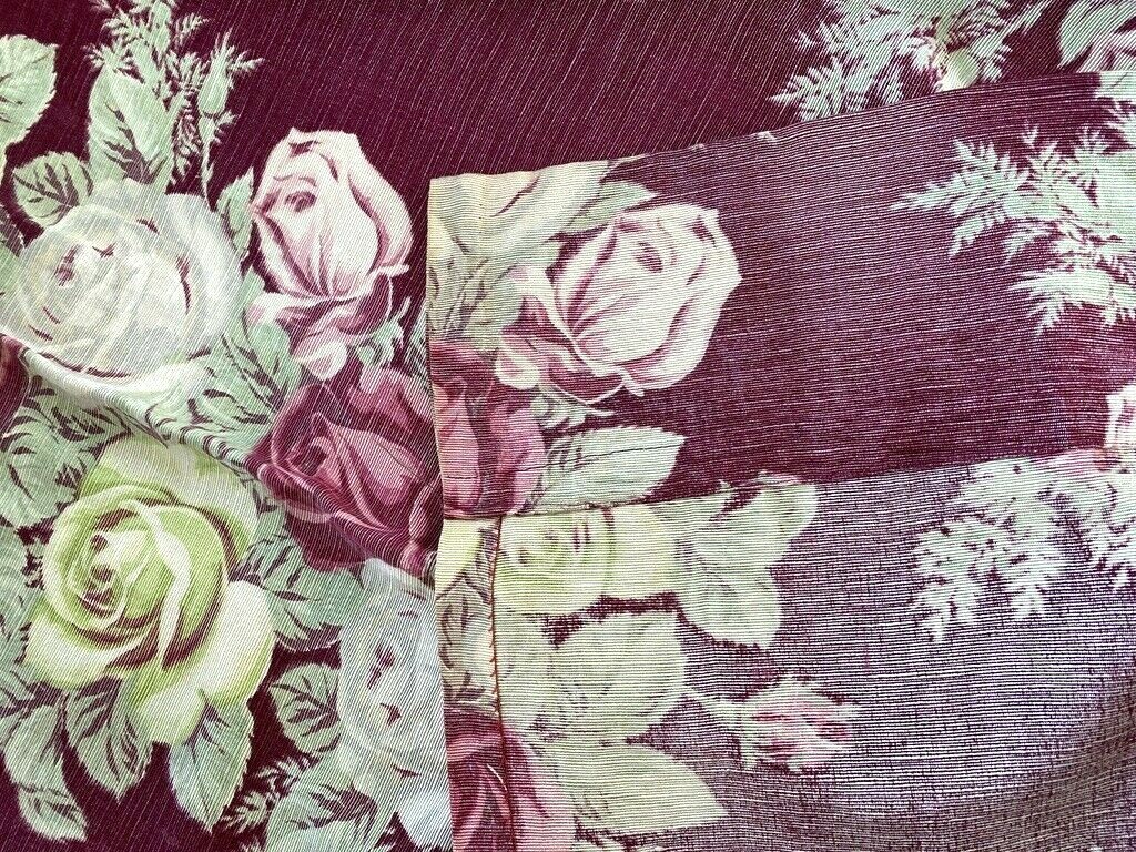 In very good condition, with normal fading and no holes or stains. Been dry cleaned and in great shape, but not like new in that they are a little faded. Ready to hang.Crudely pinch pleated. Roses look 3D.
