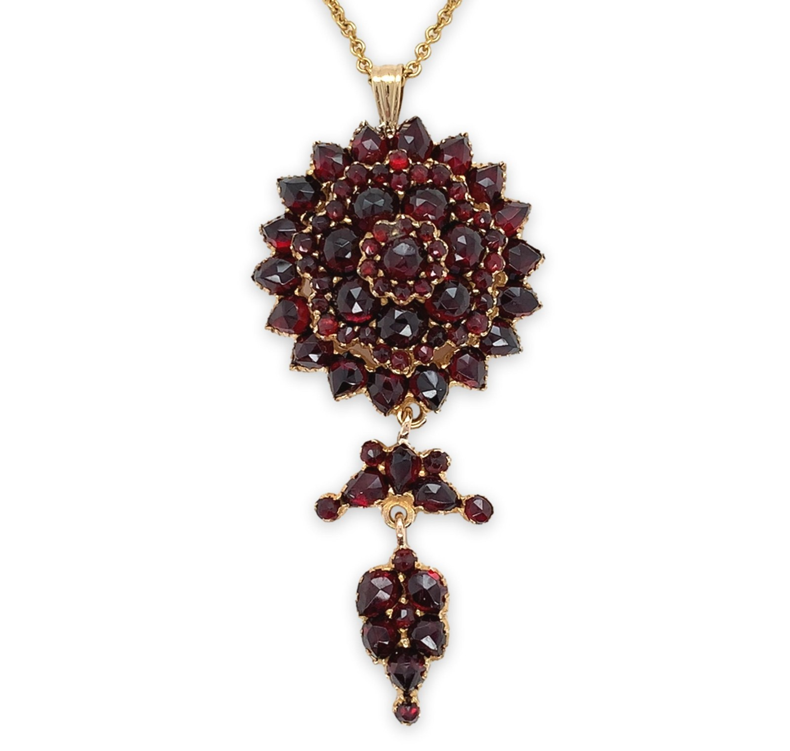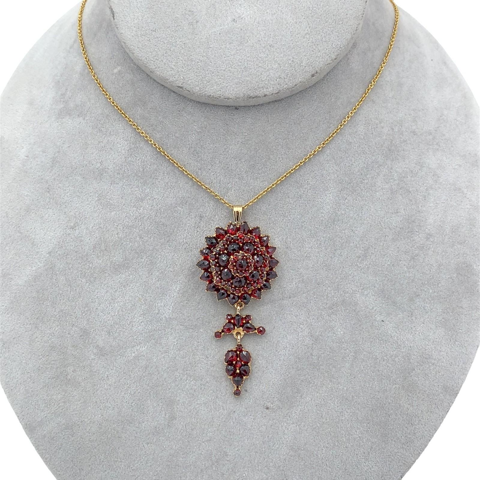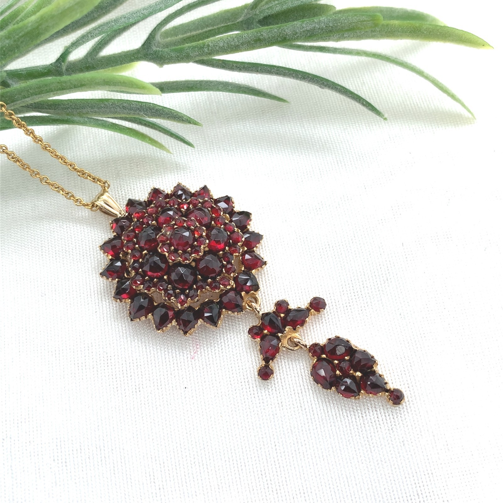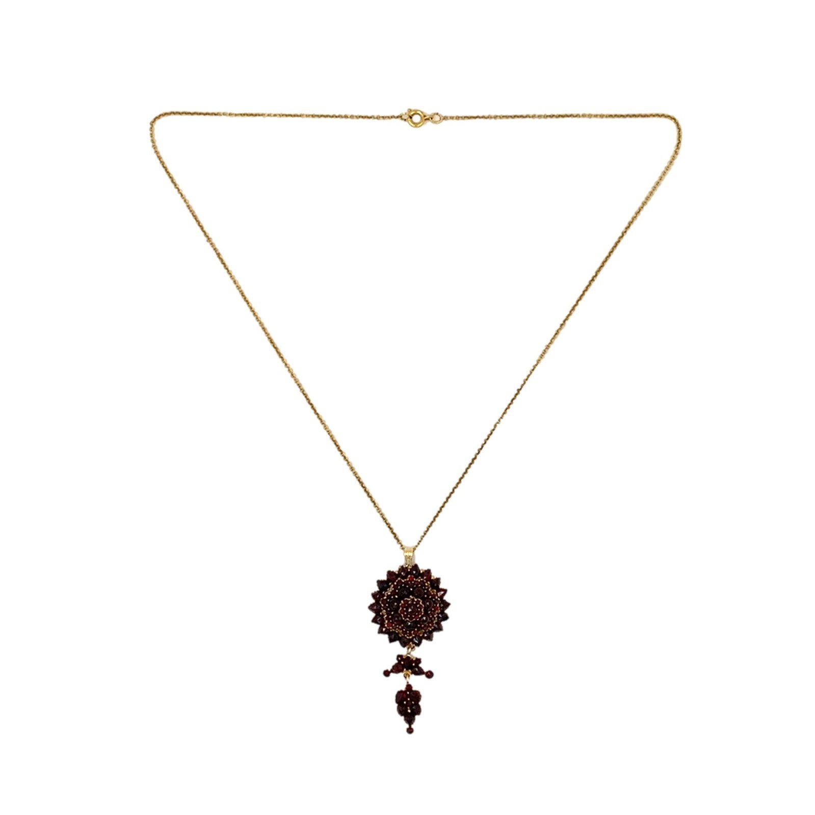 Gilt jeweler's brass Bohemian garnet pendant with drop. There are round and pear shape rose cut garnets of various sizes. The pendant with bail measures just over 2 1/4" or 2 3/16" long and just over 1" wide. The pendant dates from the 1880s with a new 14k yellow gold bail and new gold filled 18" chain. The necklace weighs 4.79 dwt. Amazing!