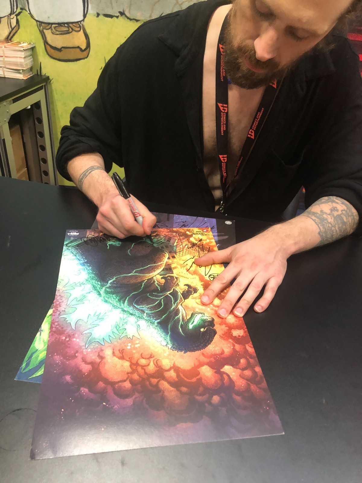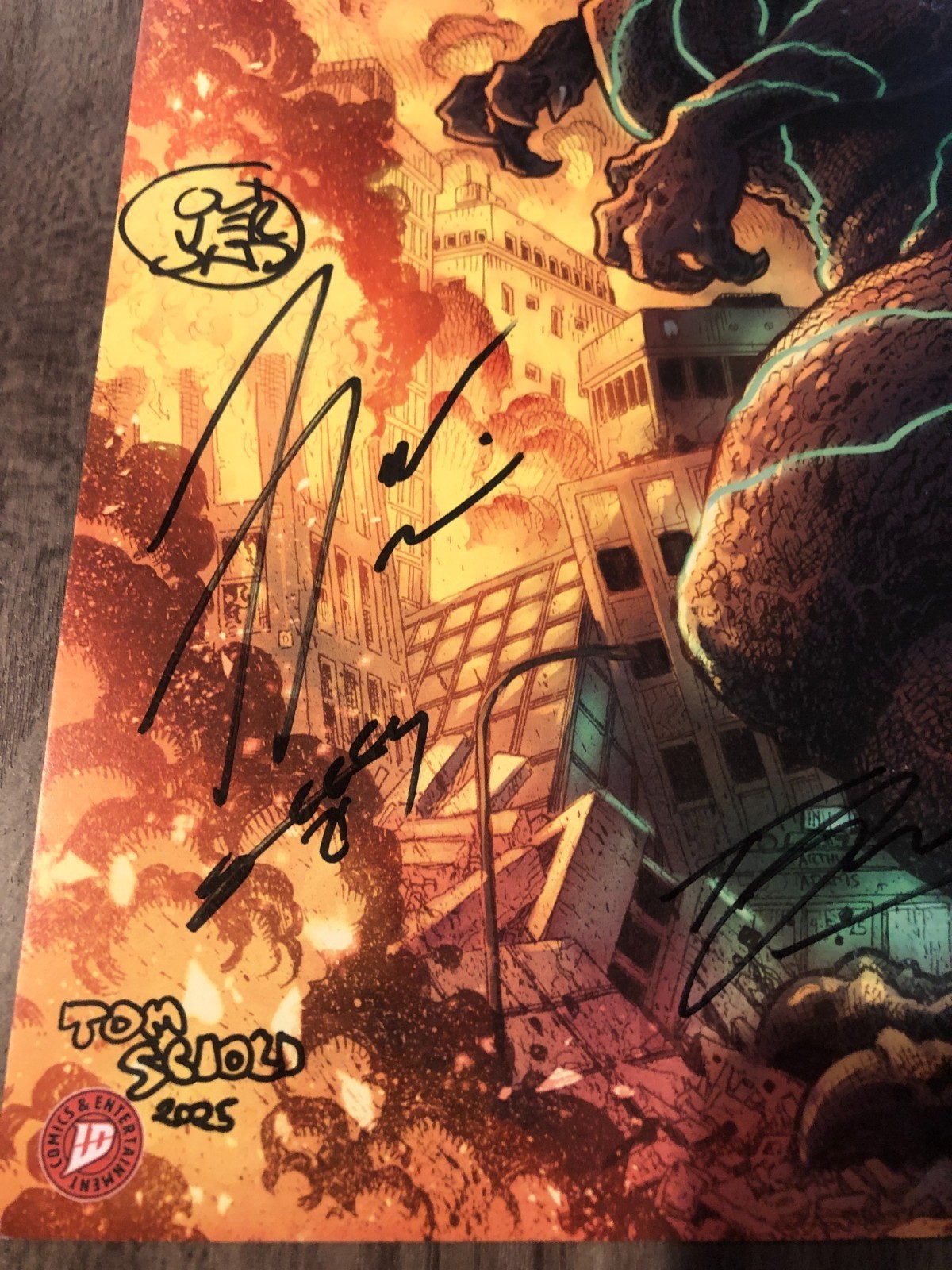 This is a GODZILLA Kai-Sei Era IDW NYCC Exclusive New York Comic Con Signed PROMO POSTER. Hand-Signed by 6 Godzilla artists writers. Tim Seeley, Oliver Ono, Frank Tieri, Tristan Jones, Jesse Hernandez, and Tim Scioli. It Measures 11 Inches By 17 inches. This was a NYCC New York Comic Con Limited promo item given out and signed at the 2025 CON. Printed on a nice heavy stock paper. It is NEW. The corners have a little bit of wear on the edge from the con. If you frame it you will not see it. Rare Poster of the Adams Variant #1 Comic. Would look great framed. D2AG