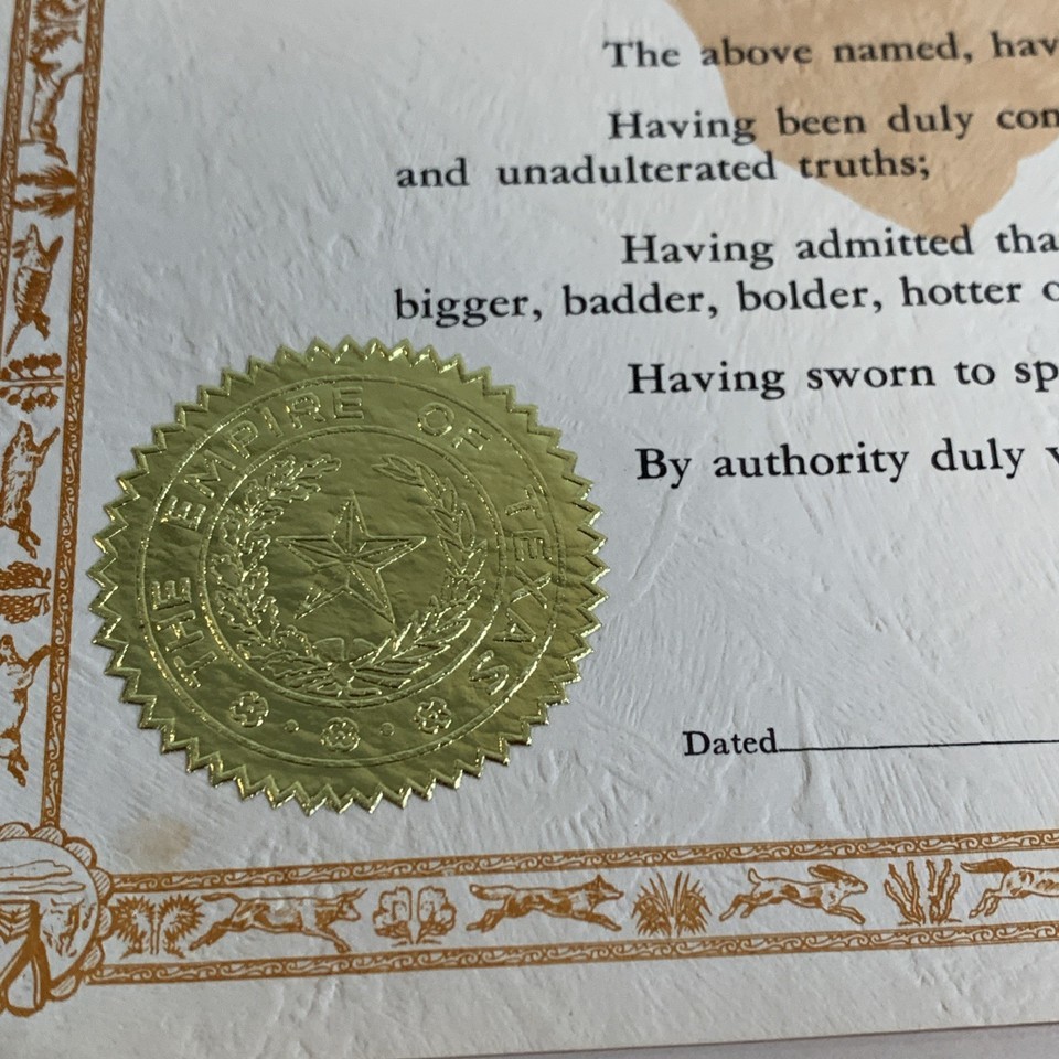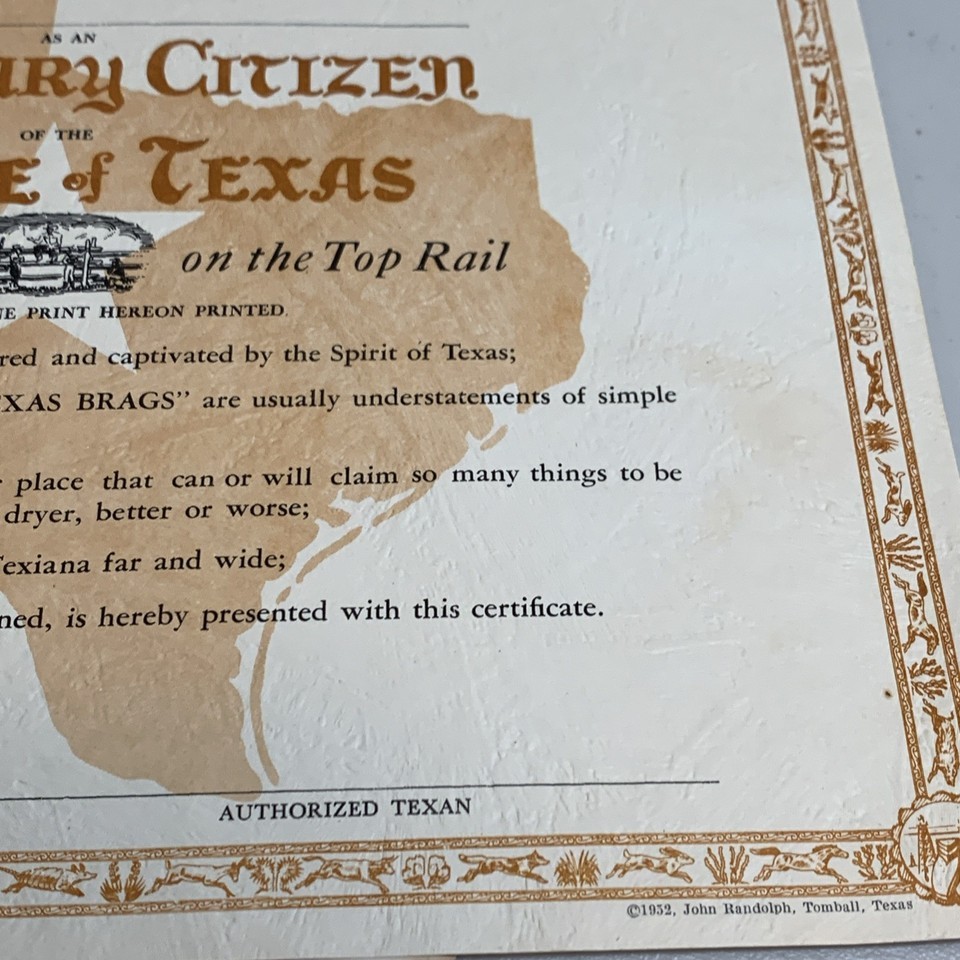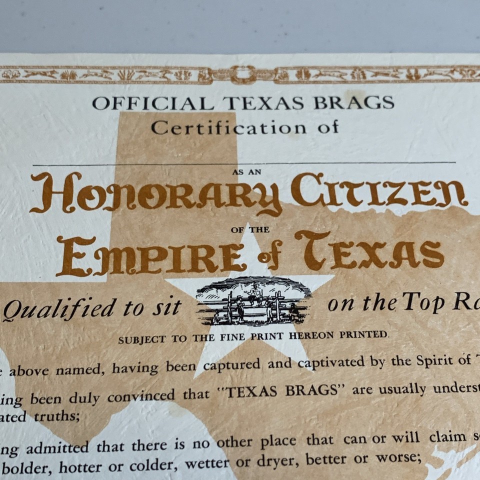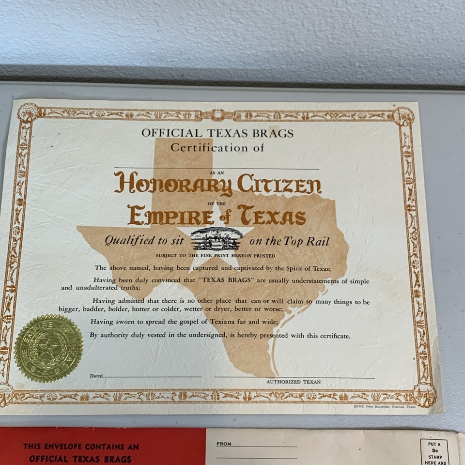 The product is a vintage official honorary citizen certificate envelope from 1952, specific to the Empire of Texas. This collectible item allows the holder to sit on the top rail and showcases the history and prestige of the state of Texas. Made in the United States, this item is a unique souvenir that represents the significance and prestige of Texas during that era.