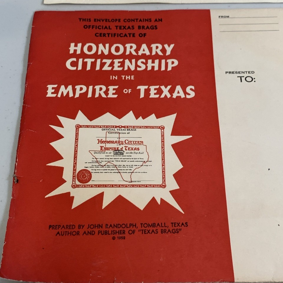 VINTAGE Official Honorary Citizen Empire Of Texas Certificate Envelope 1952