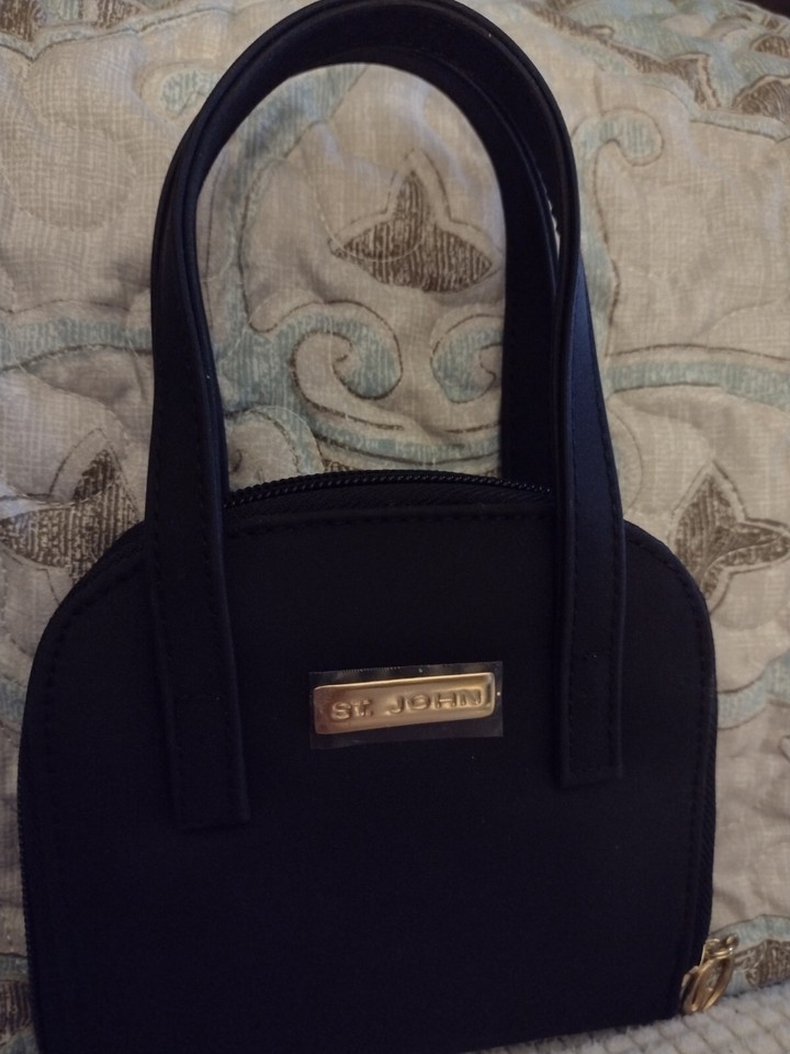 Add a touch of elegance to your outfit with this ST JOHN Mini Fabric Little Black Dressy Nylon Zipper Around Goldtone Logo. This beautiful bag has a zip closure and features a stylish logo pattern. It is perfect for a party or cocktail event, and the small size makes it easy to carry around. The bag has a black exterior and lining, with gold-plated hardware. It also comes with a coin purse and has a strap drop of 3 1/4 inches. The handles are a great addition to the design, making it easy to carry around. This bag is a must-have for any fashion-forward woman.