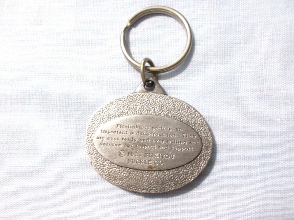 FIREFIGHTER Ever Ready Ever Willing PEWTER ENAMEL FIRE TRUCK KEY RING SISKIYOU