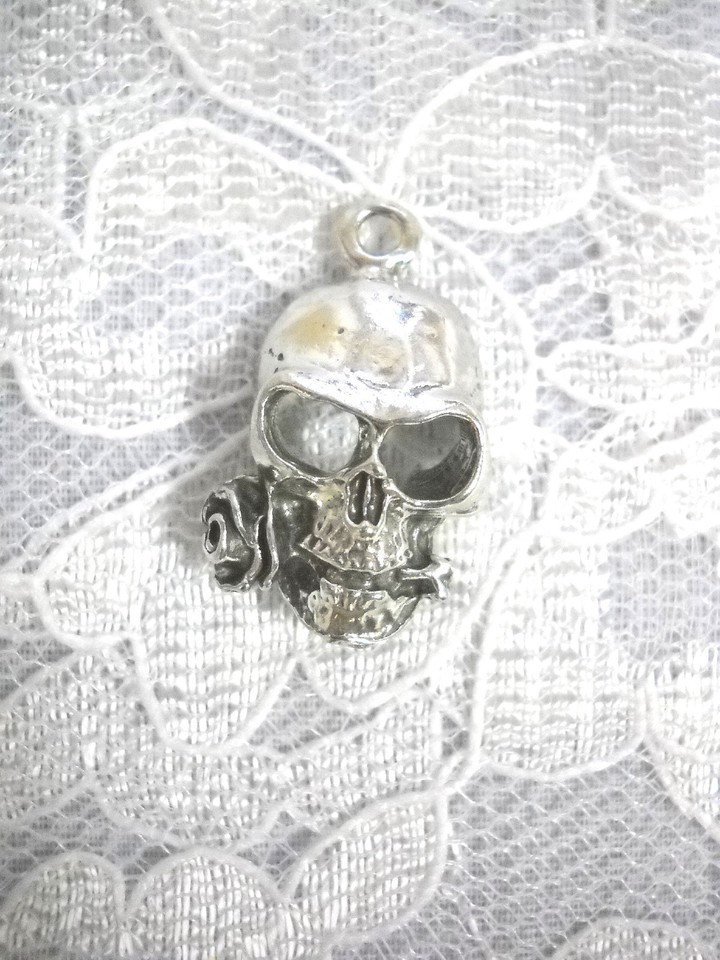 HUMAN SKULL ROSE FLOWER IN TEETH ORIGINAL USA CAST PEWTER PENDANT ADJ NECKLACE