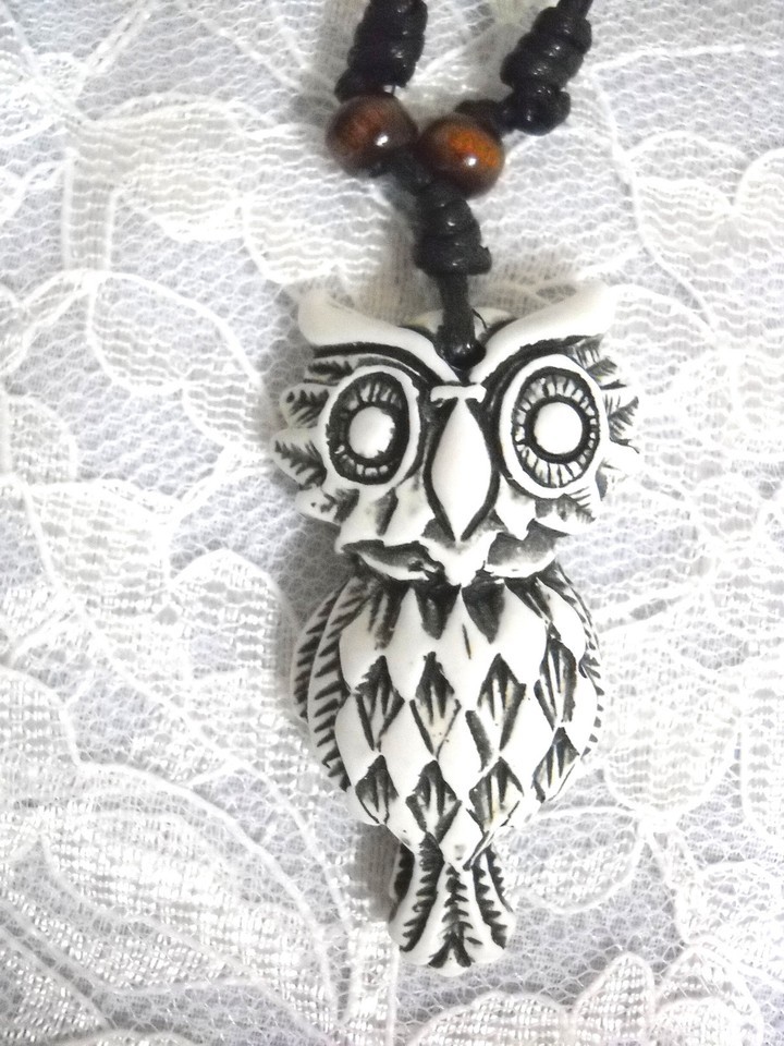 WHITE WITH BROWN RESIN NIGHT HOOT OWL BIRD PENDANT ADJ STRING CORD NECKLACE