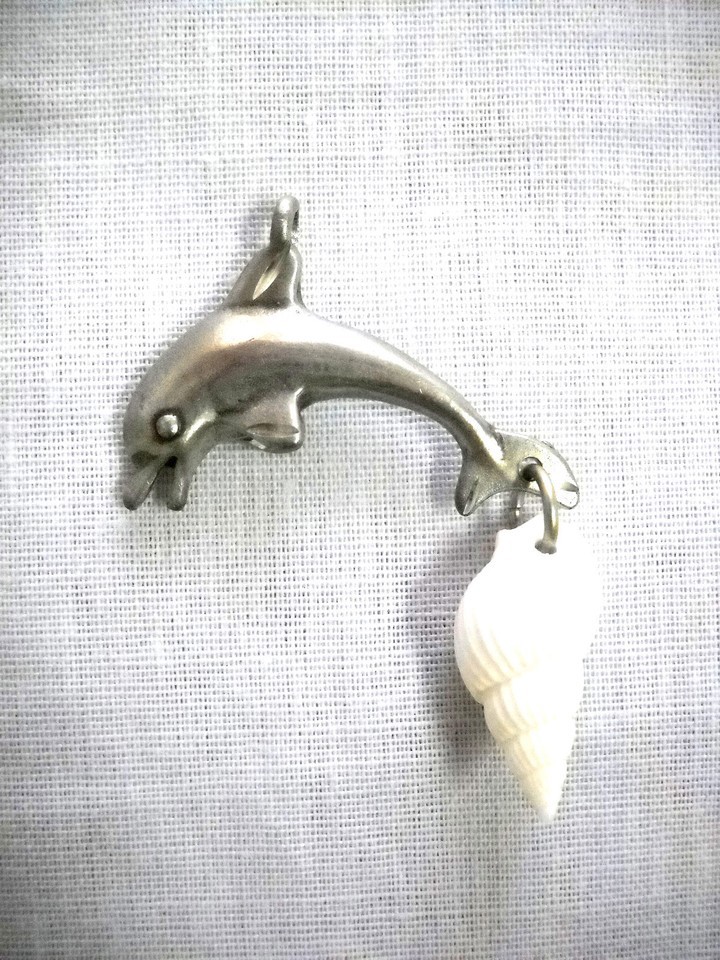 SINGLE MARINER DOLPHIN WITH A REAL WHITE FULL SHELL DANGLING UNDER IT. There is a touch of hand engraving on fins bodies for light catching details
