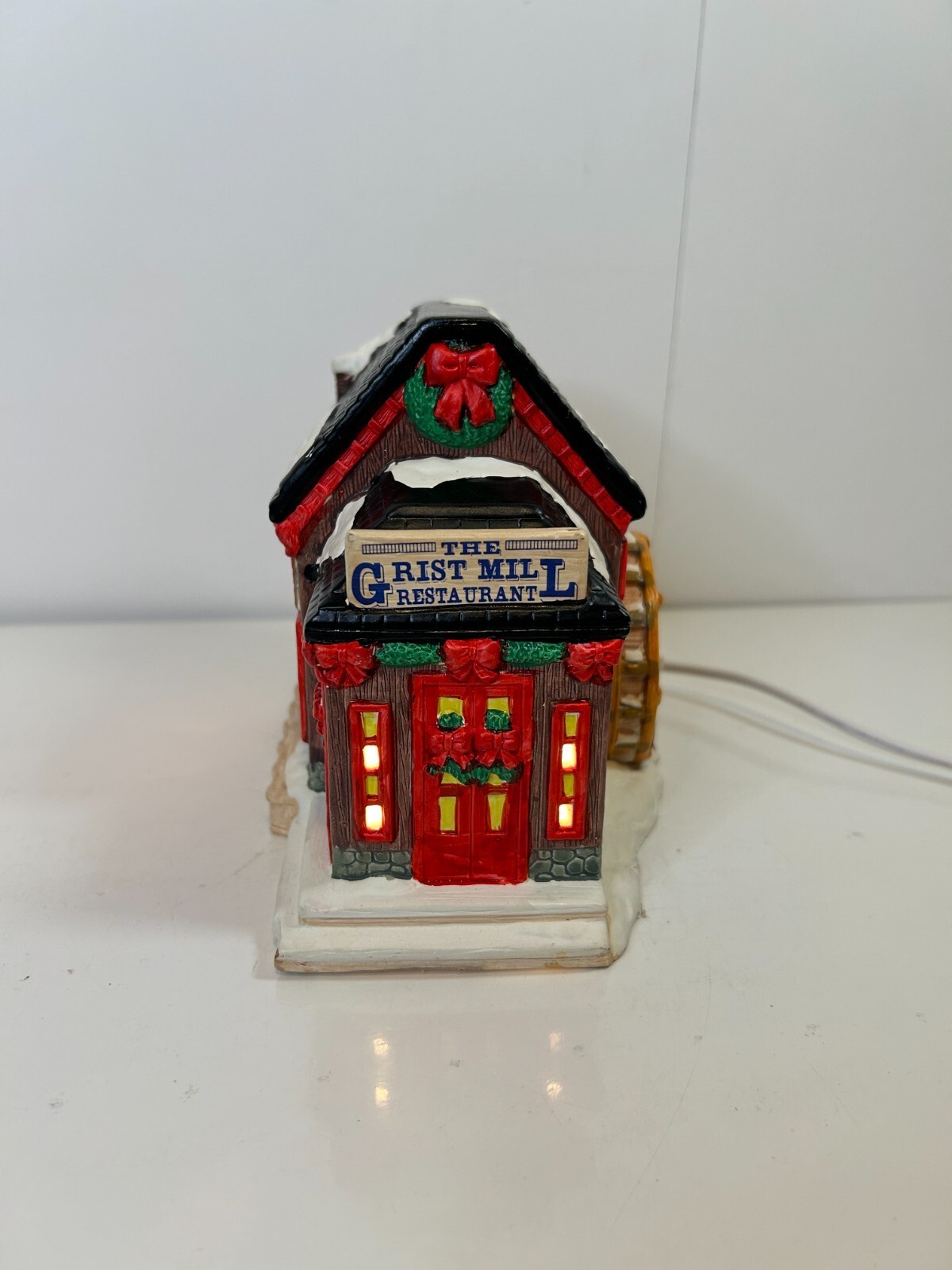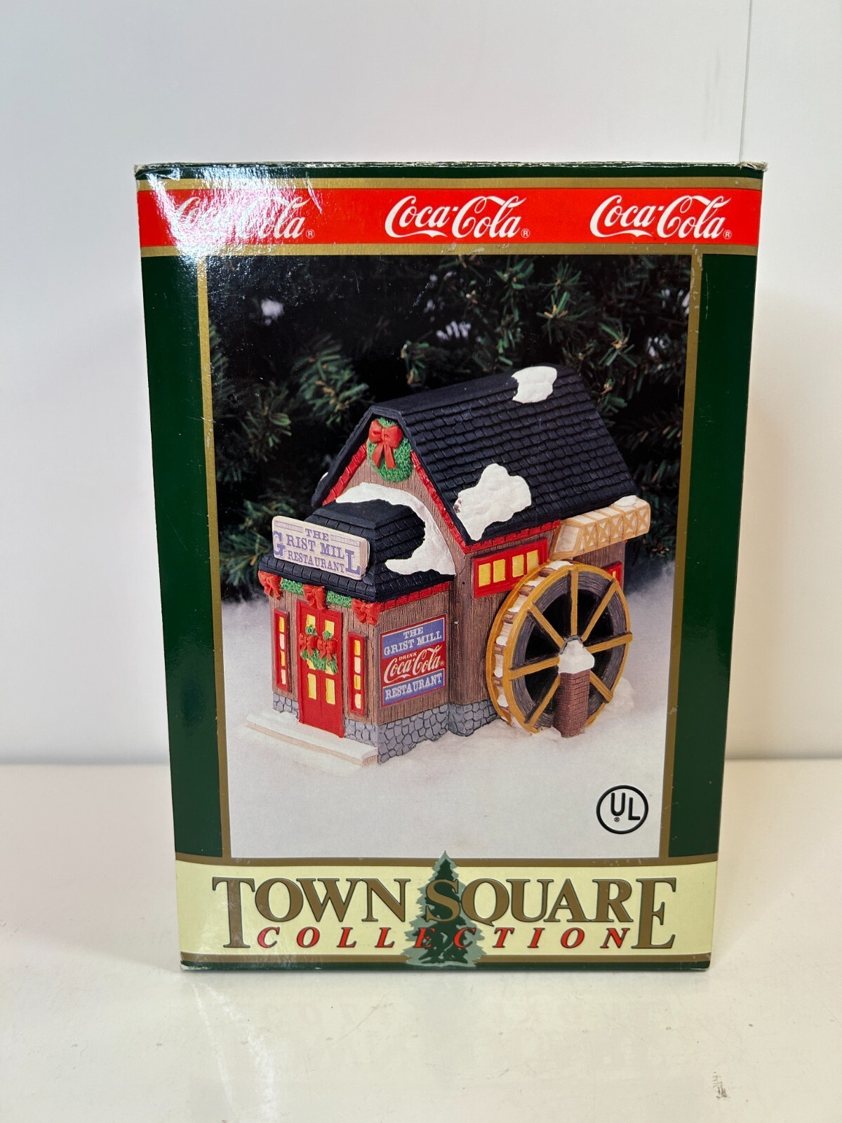 Add nostalgic holiday charm to your collection with the 1995 Coca-Cola Town Square Collection ?The Grist Mill Restaurant.? This lighted ceramic building features detailed stone and brickwork, Coca-Cola signage, and a water wheel design that recalls classic Americana.