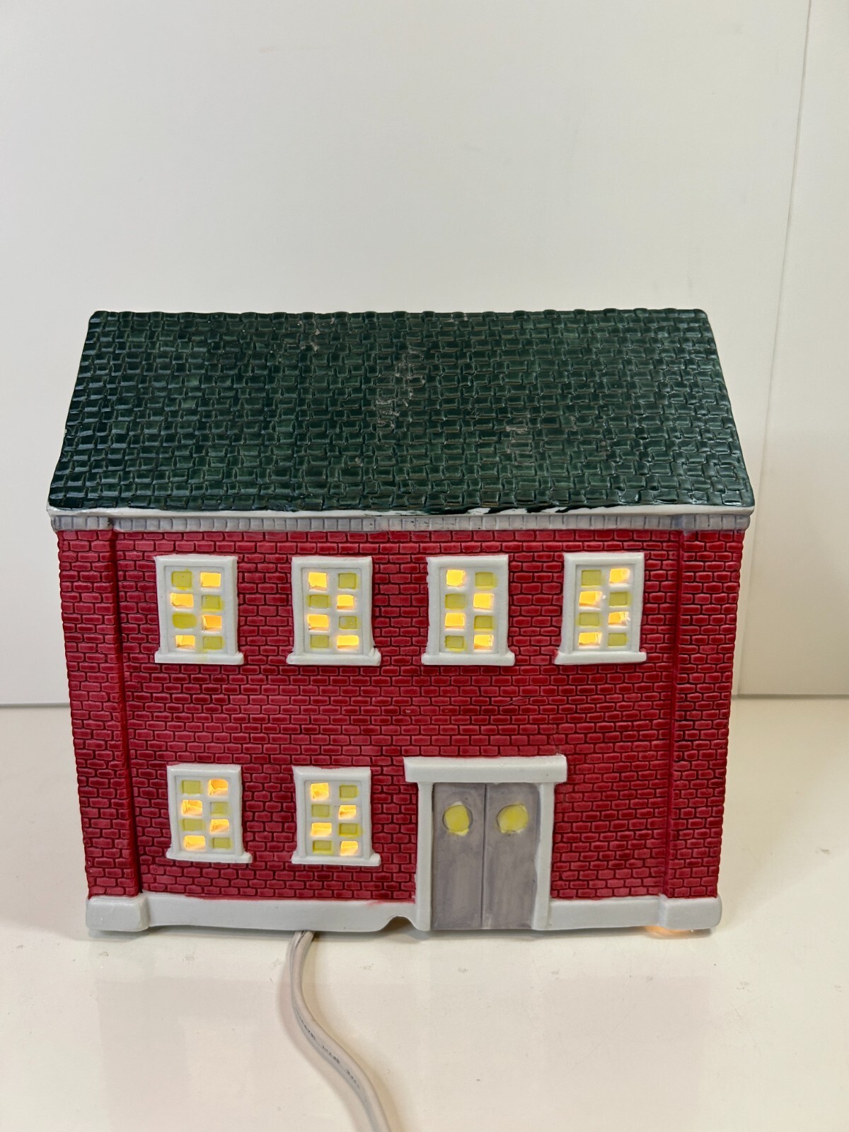 The piece measures approximately 7" tall and includes its working light cord to create a festive glow. It comes with the original box and shows light wear from age, but the building itself remains in very good condition. A great addition for Coca-Cola memorabilia collectors or anyone creating a vintage-style Christmas village.