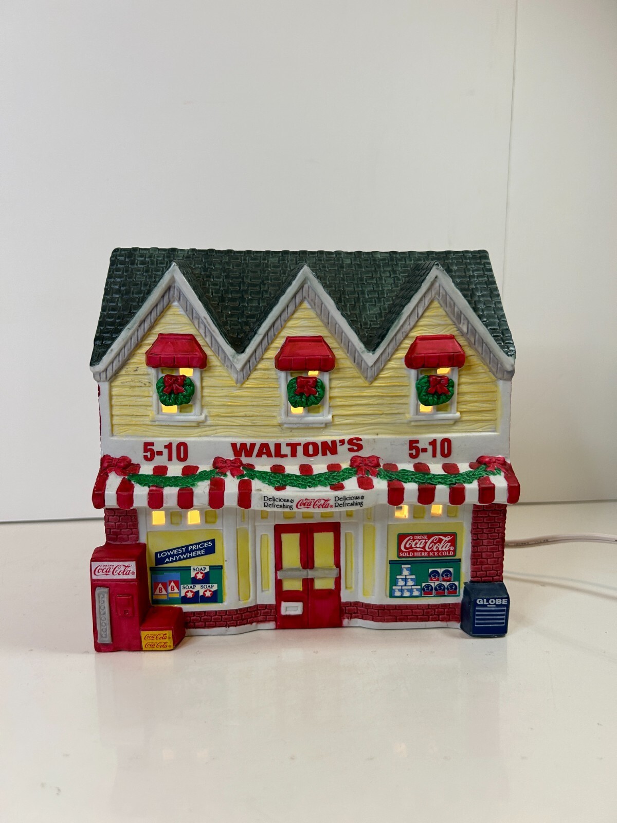 Add nostalgic charm to your display with the 1996 Coca-Cola Town Square Collection ?Walton?s 5-10 General Store.? This ceramic lighted building is modeled after the iconic five-and-dime store, complete with Coca-Cola advertising and hand-painted details.