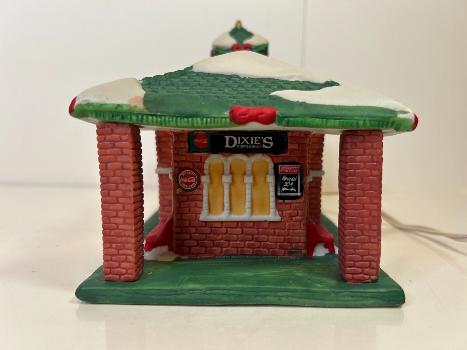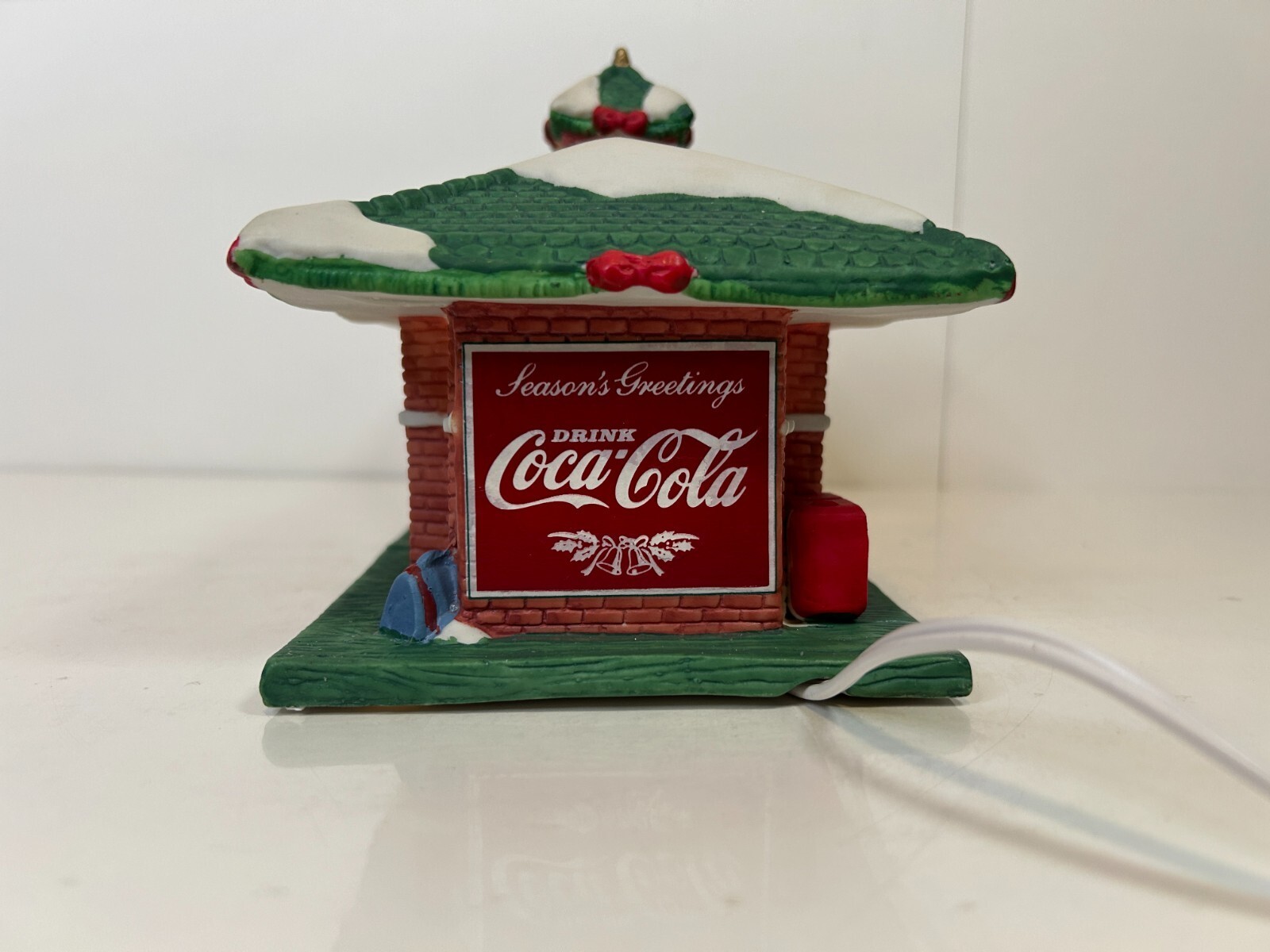 The building measures approximately 6.5" tall and includes its working light cord to give a warm holiday glow. It comes with the original box and shows light wear from age, but the piece itself remains in very good condition. Perfect for Coca-Cola collectors or anyone completing a Christmas village display.
