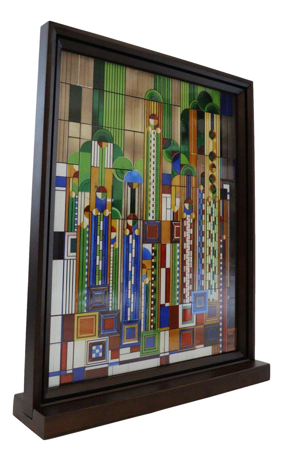 ? The measurements of this beautiful Frank Lloyd Wright glass art panel plaque is L: 12" x H: 15" x Thickness: 0.75" The wooden base measures L: 12.125" x W: 2.75" x H: 0.75".