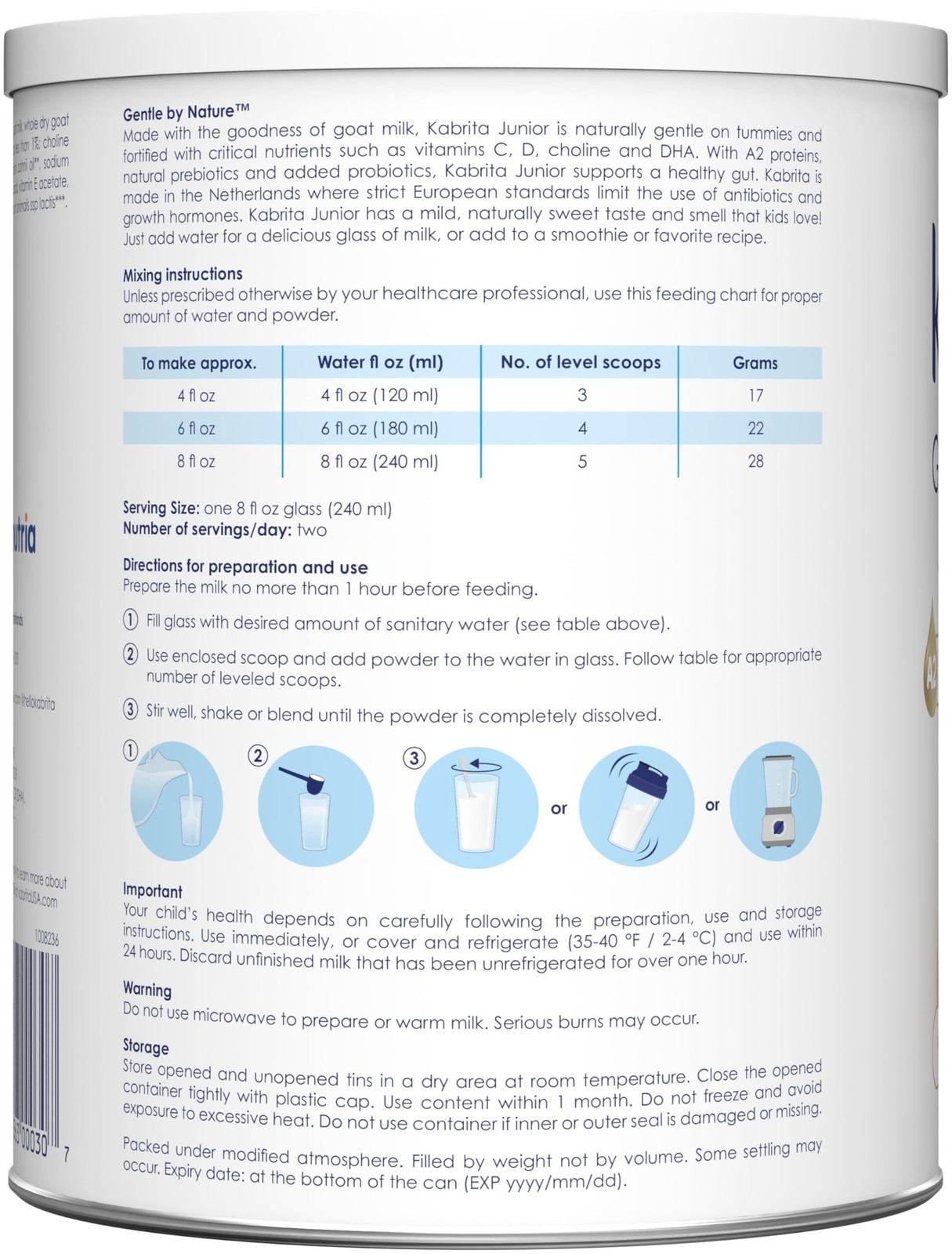 Pack of 2 This baby formula is not expired ? the expiration date is 01/2027 ? HIGH-QUALITY GOAT MILK POWDER FOR KIDS: Kabrita Junior is easy to digest, highly nutritious fortified with essential nutrients, supporting natural growth development in children ages 2-7. ? CLEAN SAFE POWDERED MILK FILLED WITH NUTRIENTS: Kabrita Junior Nutrition powdered milk is highly nutritious goat milk adhering to strict European standards, which limit antibiotics hormones. Our powdered milk is non-GMO, and easy to digest. ? SUPPORT IMMUNITY, GUT HEALTH DEVELOPMENT: Our goat milk powder is fortified with Vitamins C, D, E, calcium, gentle A2 protein, added prebiotic fiber inulin, and probiotic B Animalis to support a balanced gut and better digestion in little ones. ? MADE IN THE NETHERLANDS: We created Kabrita Goat Milk Junior Nutrition without any GMO ingredients and following strict European standards, which limit the use of antibiotics and growth hormones. Kabrita products are based on sound science, and our development team has a program specializing in goat milk research. ? QUICK AND CONVENIENT: With all the gentle benefits and great taste of goat milk, Kabrita Junior has a naturally sweet taste and smell that kids love. Add it to your child?s breakfast essentials or blend it into their favorite smoothie. Minor dents may occur during shipment