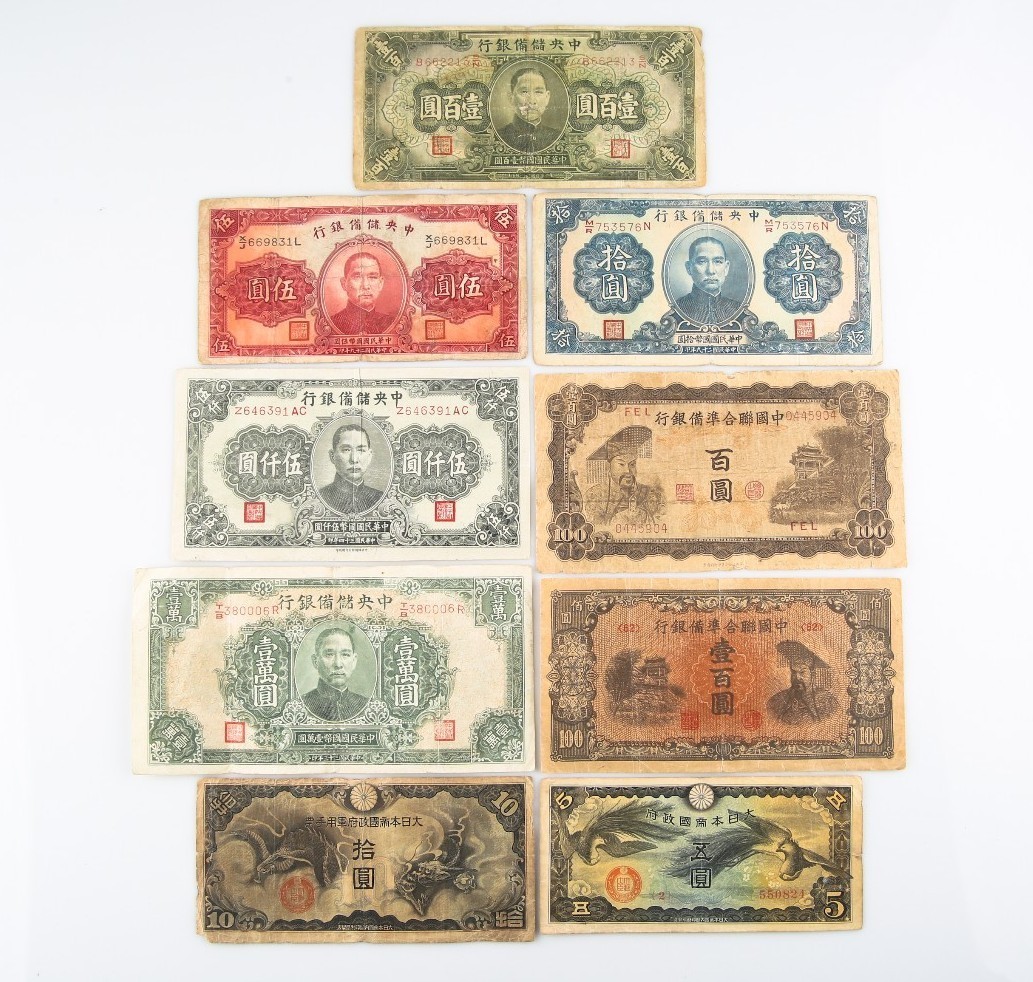 1939-1945 China Yuan e Japan Yen Notes, lotto di 9 anni