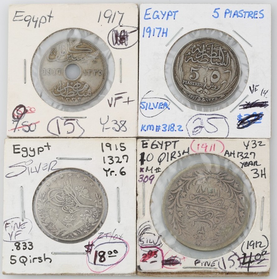 4 monete egiziane Egitto 1911 10 Qirsh 1917 5 Piastre 1911 5 Qirsh 1917 10 milliemi