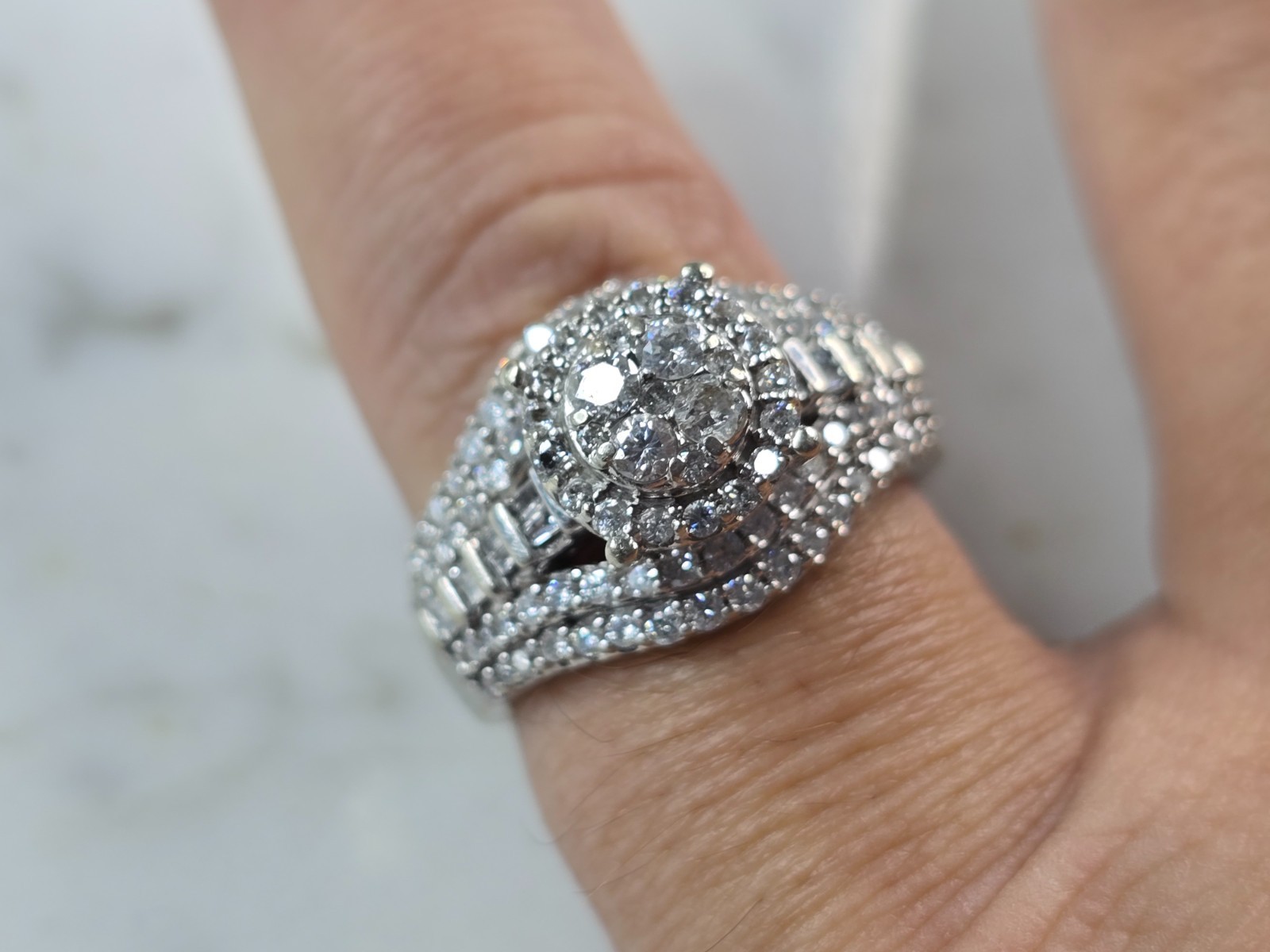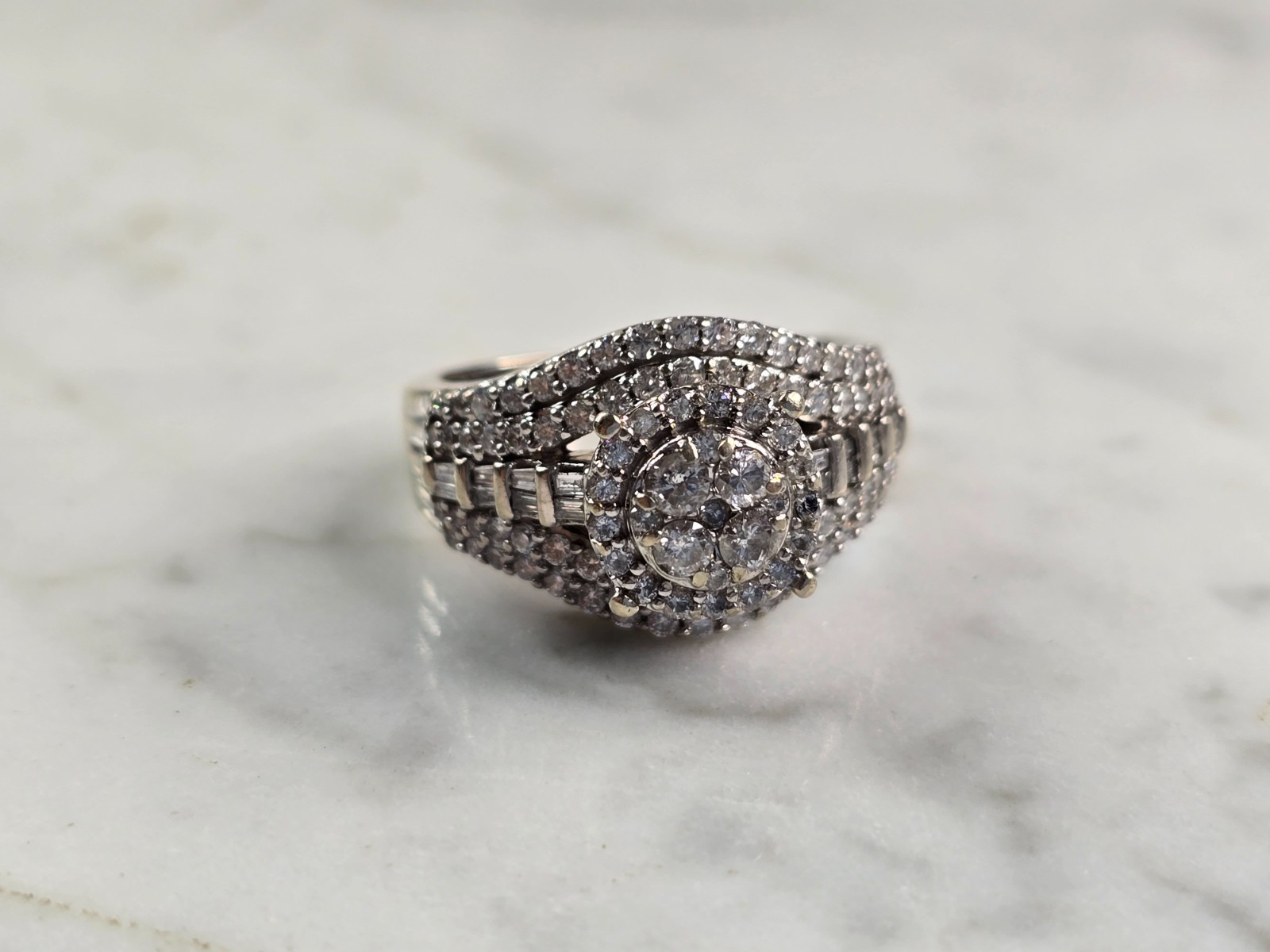 A WOMENS VINTAGE ESTATE 10K WHITE GOLD DIAMOND RING. THE RING IS A SIZE 6.25, AND WEIGHS 8.5g. RING HAS A LITTLE OVER 1.0cts OF DIAMONDS. RING IS NOT MARKED , BUT IT HAS BEEN TESTED AND IS GUARANTEED TO BE AS DESCRIBED. THIS IS A BEAUTIFUL GIFT FOR THAT SOMEONE SPECIAL. ANY QUESTIONS, PLEASE DON'T HESITATE TO ASK. BE SURE TO CHECK OUT SOME OF MY OTHER GREAT ITEMS UP FOR SALE. THANK YOU.