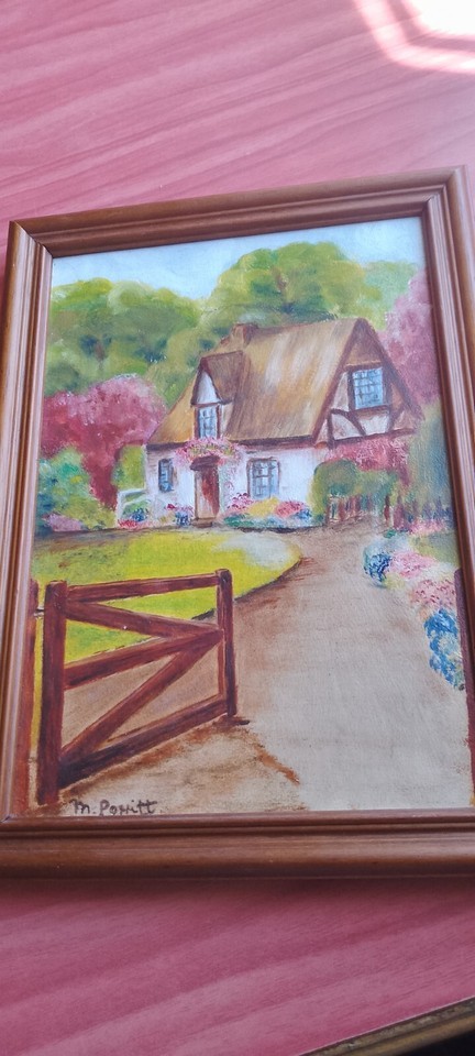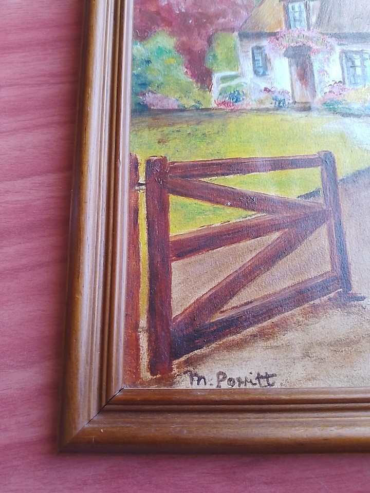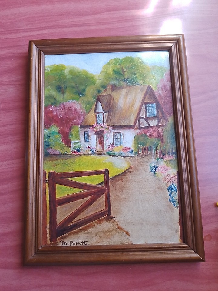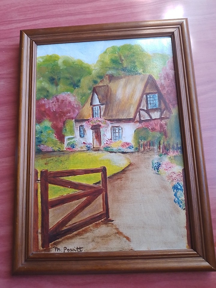 This is a charming painting of a picturesque cottage nestled in a lush green landscape. The cottage is white with a thatched roof, and features a quaint front door with a flower box and a small window. A wooden fence with a gate leads up to the cottage, and there is a path lined with colorful flowers. The surrounding countryside is idyllic, with rolling hills, lush trees, and a clear blue sky.