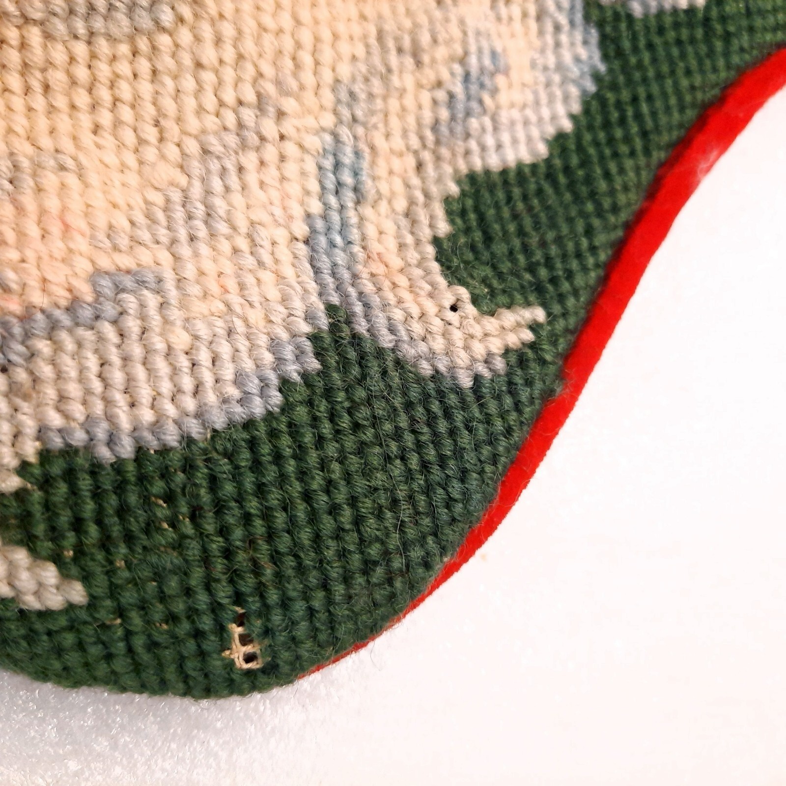 Some missed stitching spots as shown, otherwise very good condition. Red velvet backing. I believe this is handmade.